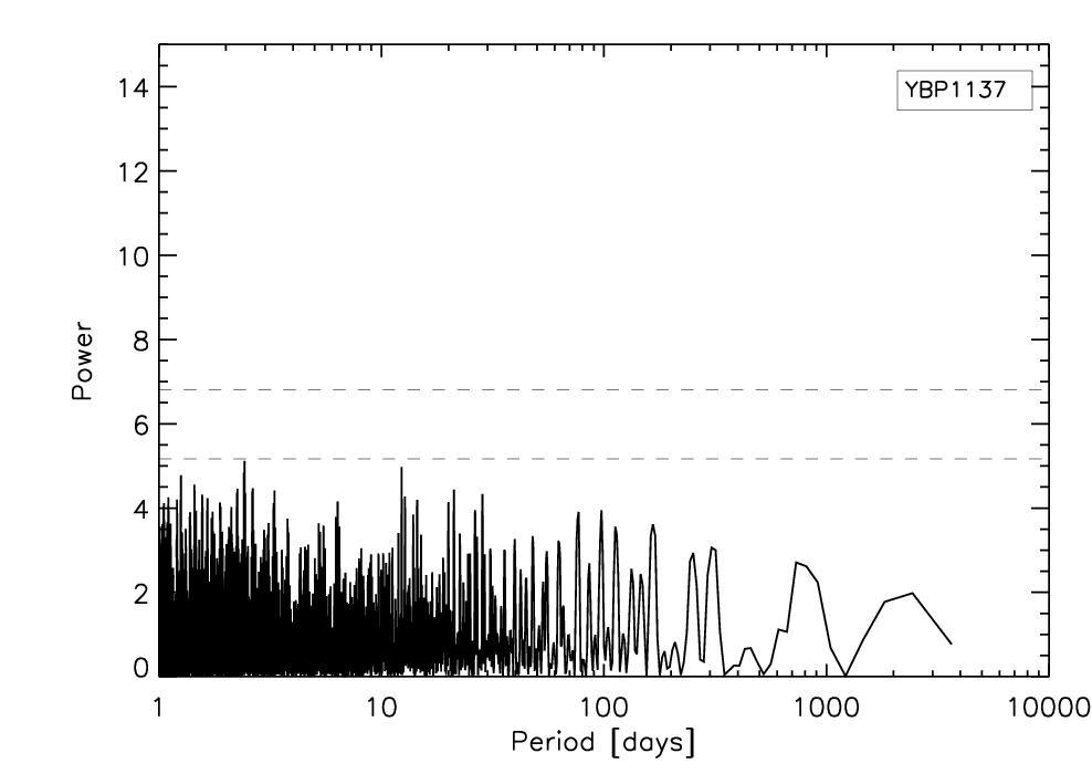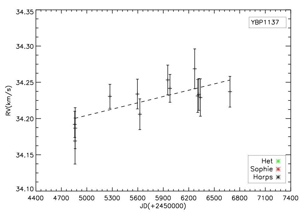 Left: RV time series with the fitted linear trend of YBP1137 overlaid. Right: periodogram of the residuals after the RV trend has been removed. Same symbols as in Fig. 3.
