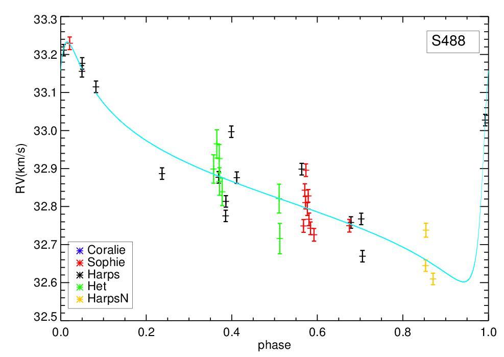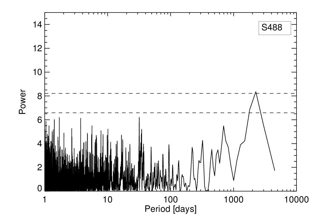 Phased RV measurements and Keplerian best fit (left), periodogram of the RV data (center), and periodogram of the residuals for S488.