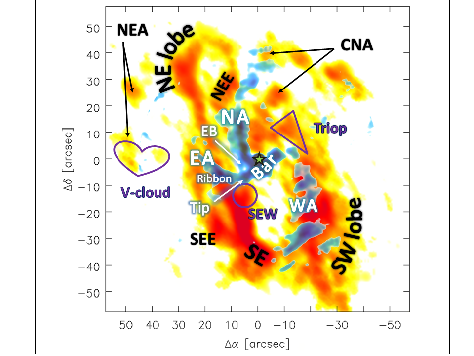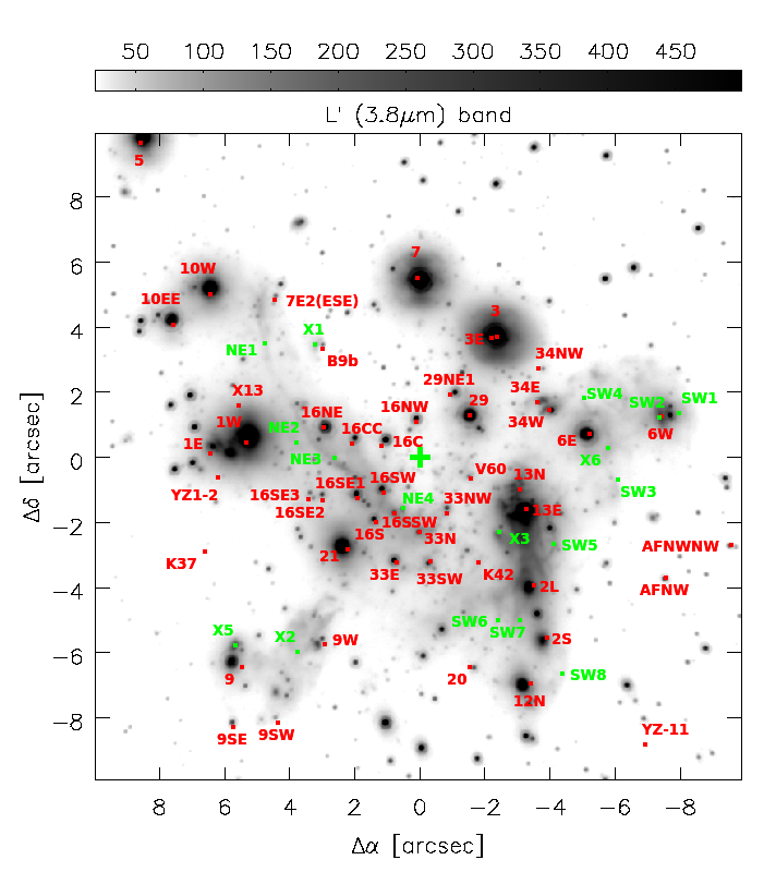 Left: overview of the structures in the inner 4.8 pc of the GC. Shown in orange: CND (CN(2–1), Martín et al. 2012); blue: minispiral (100 GHz continuum, this work); and green star: Sgr A*. The abbreviations are as follows: NE lobe for northeastern lobe, SW lobe for southwestern lobe, SE for southern extension, NEE for northeastern extension, CNA for CND-northern Arm, NEA for northeastern arm, NA for northern arm, WA for western arc, EA for eastern arm, and EB for eastern bridge. The new defined regions are southern extension west (SEW), southern extension east (SEE), Triop, and V-cloud. Right: overview of the stars and filaments Paumard et al. (2006), Viehmann et al. (2006), Mužić et al. (2007) mentioned in this work, demonstrated for the inner 20′′ (0.8 pc) on a Very Large Telescope (VLT/NACO) NIR L’ (3.8 μm) emission map (Sabha, priv. comm., here: arbitrary units).