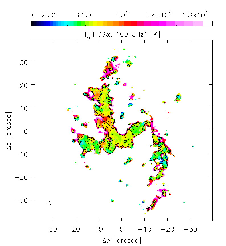 Electron temperature distribution in the inner ≲1.6 pc. Top: based on H39α (inner 40′′) and tapered to a resolution of 1.5′′ with contours of [4, 6, 8, 10] × 1000 K. Bottom: same as top, but based on H51β (inner 20′′). Maps on the uncertainties can be found in Fig. A.11.