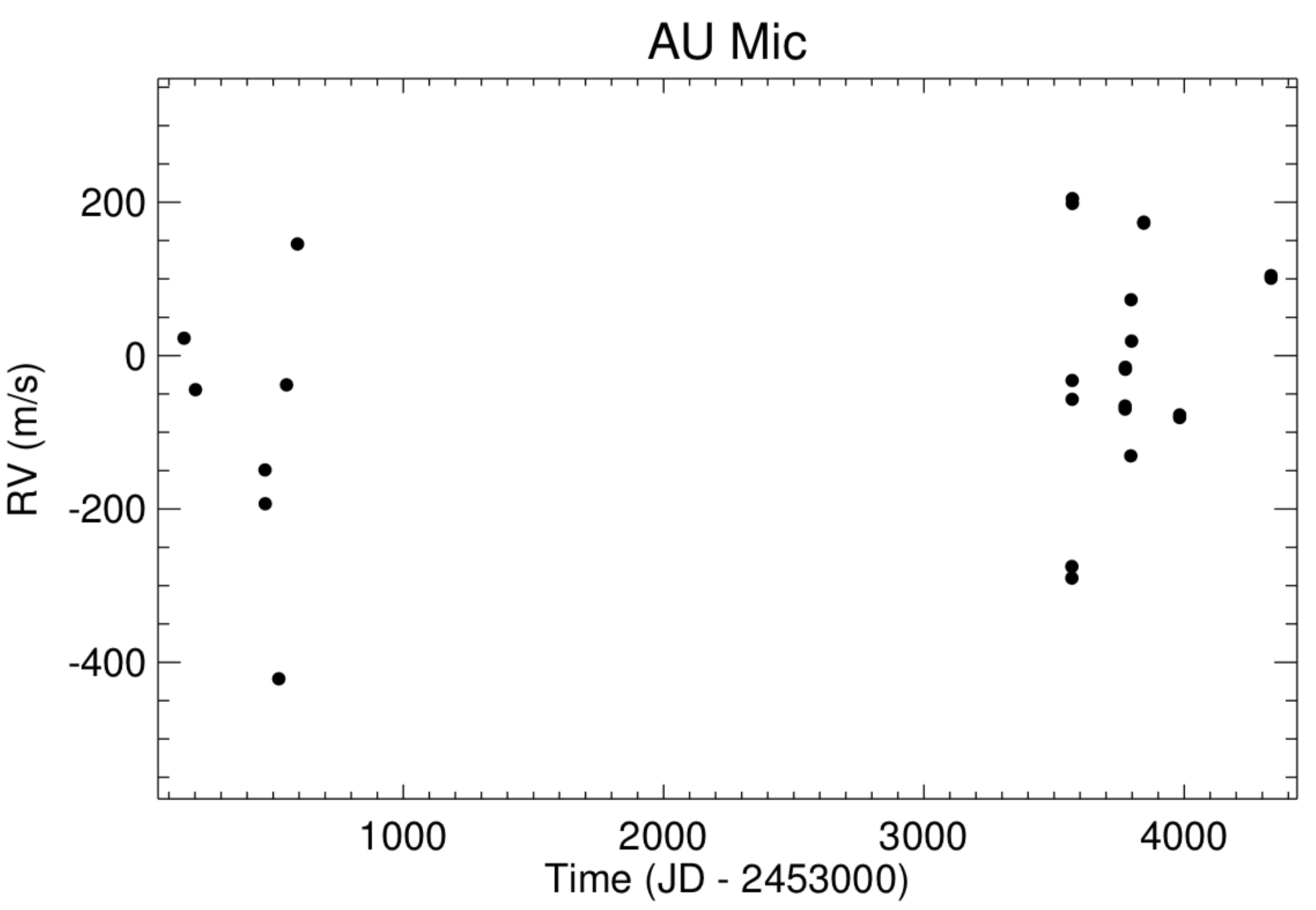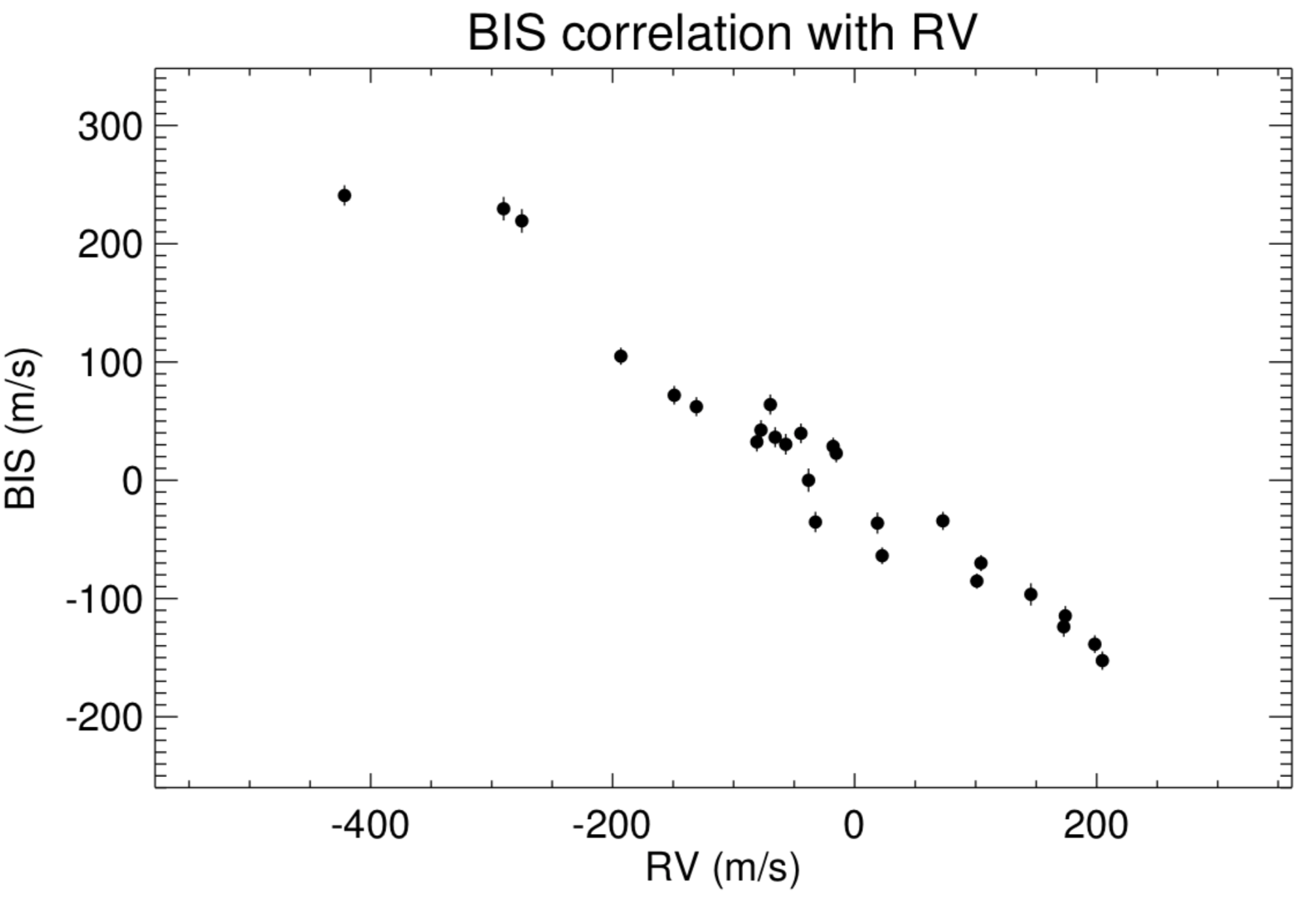 AU Mic initial RV time series (top left), correlation of RV data with the bisector velocity span (top right), and RV corrected from the bisector velocity span correlation (bottom).