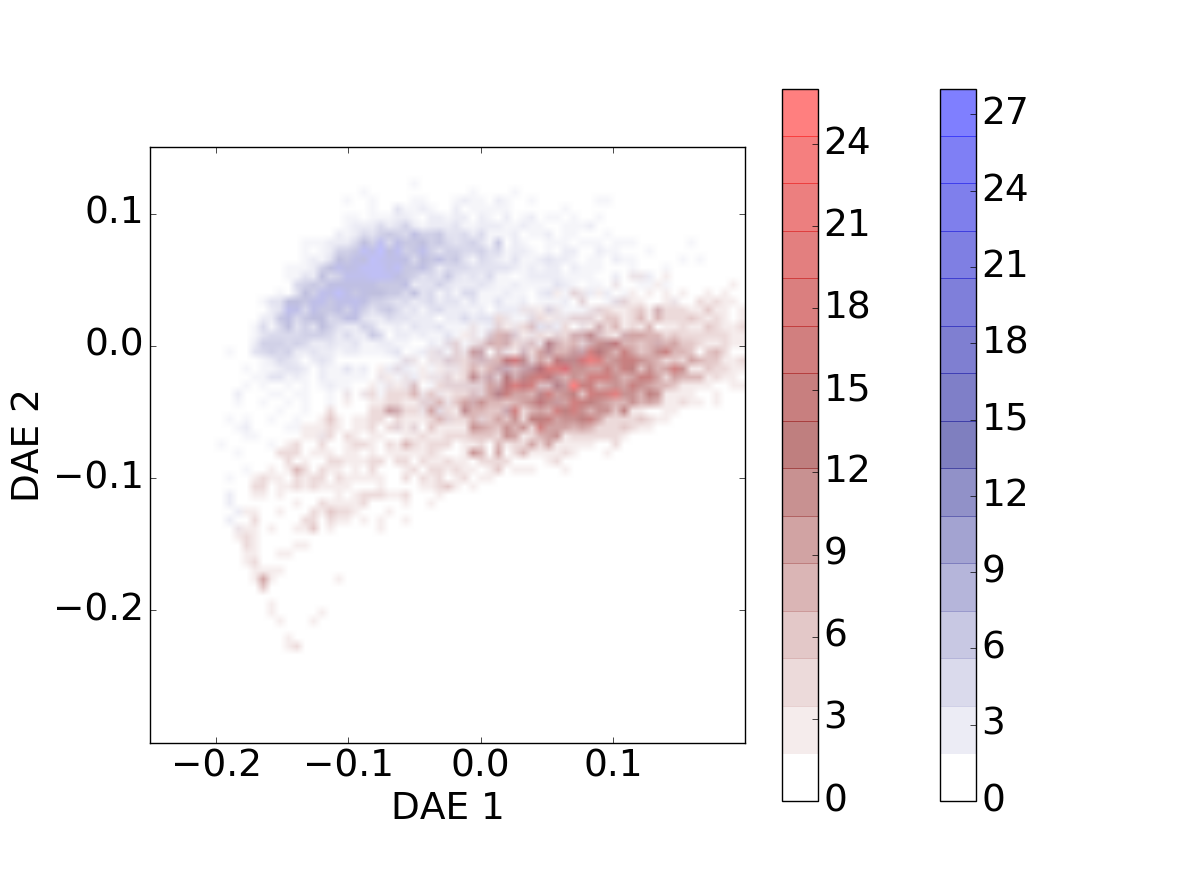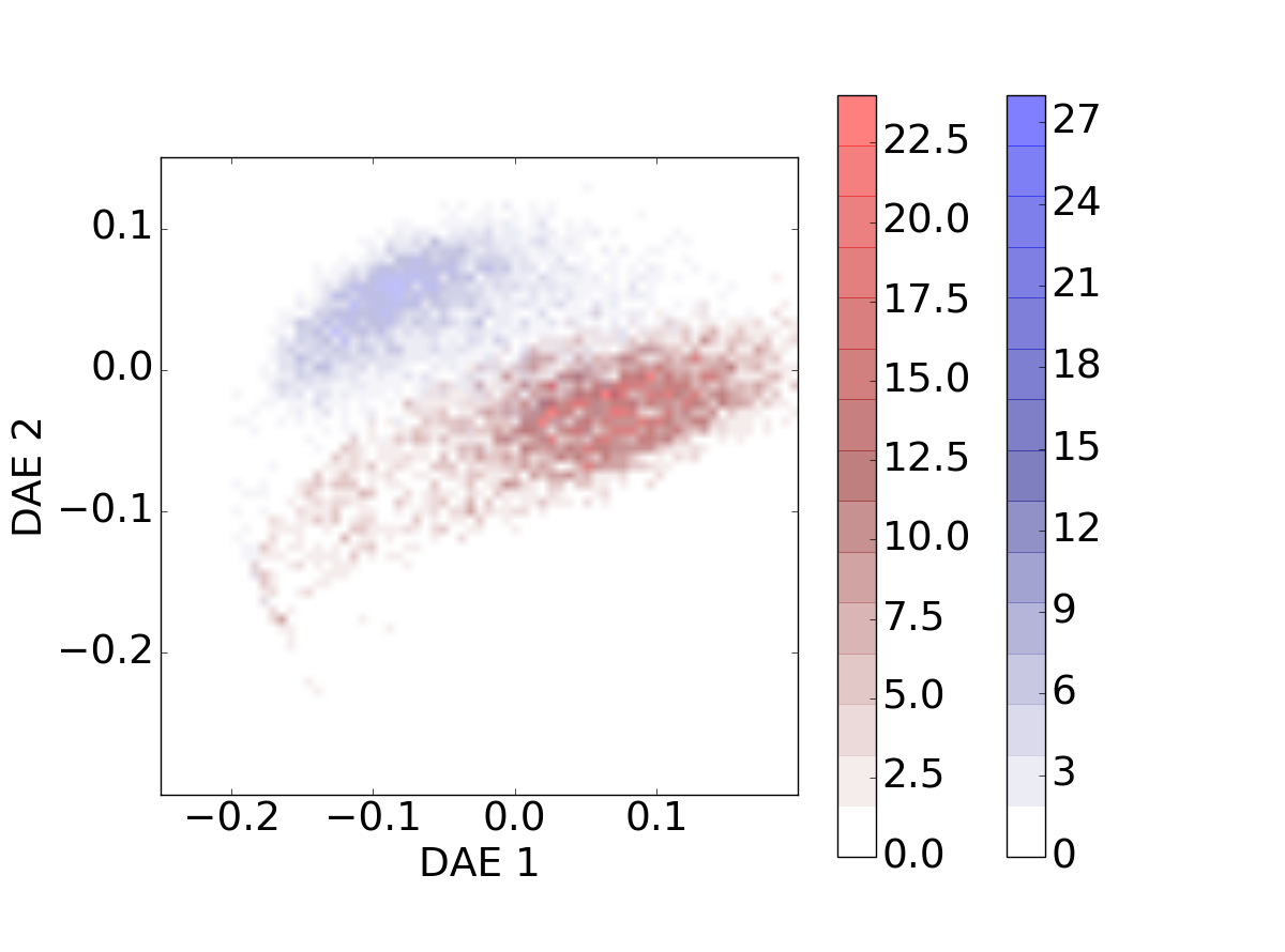 Histogram of the training set and the test set on the DAE diagram. In the new plane, galaxies classified as star-forming galaxies in the COSMOS2015 catalog are depicted in blue, while the quiescent galaxies are shown in red.