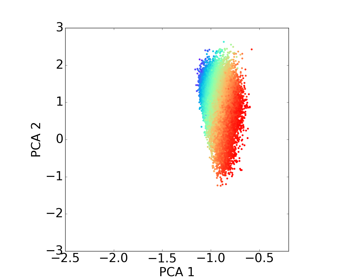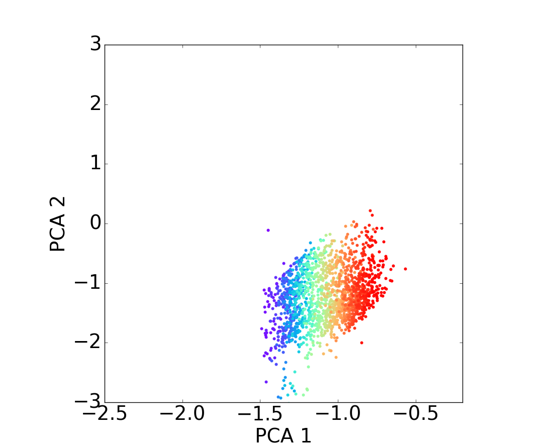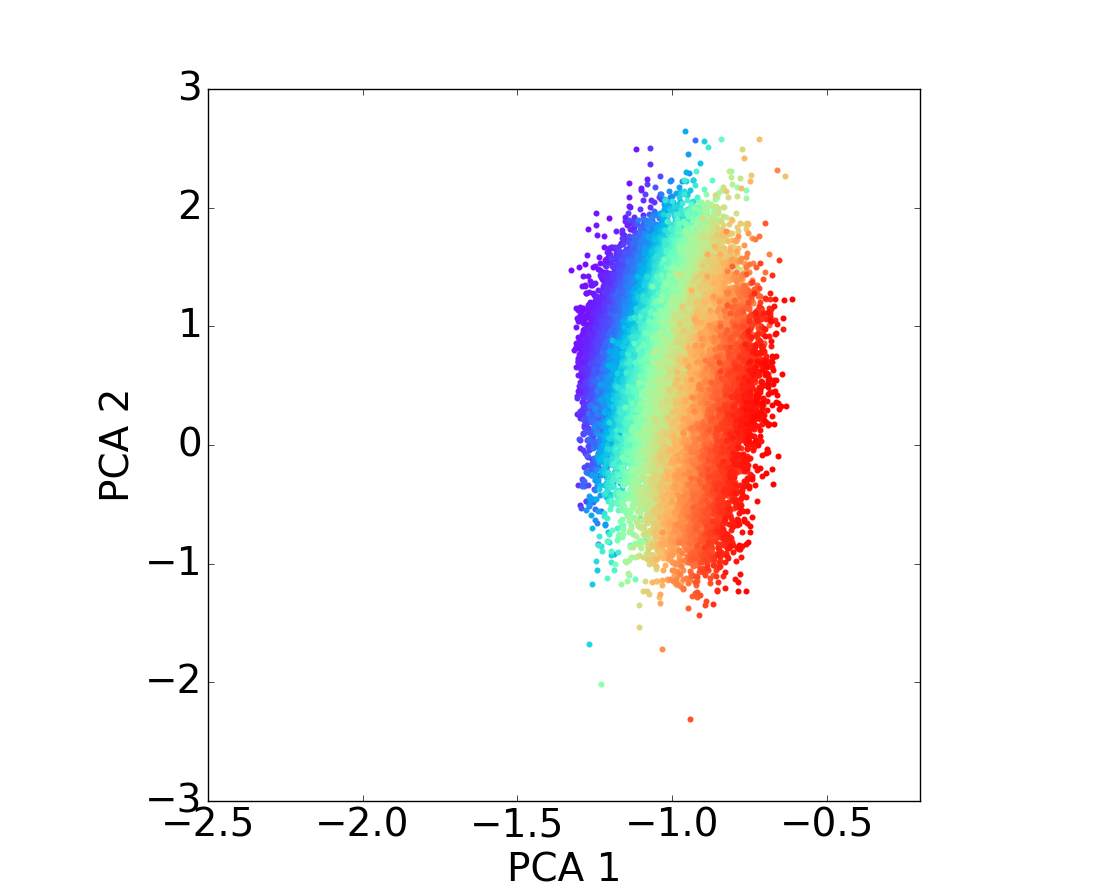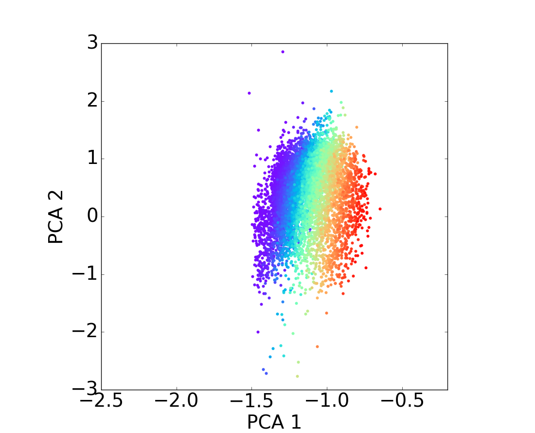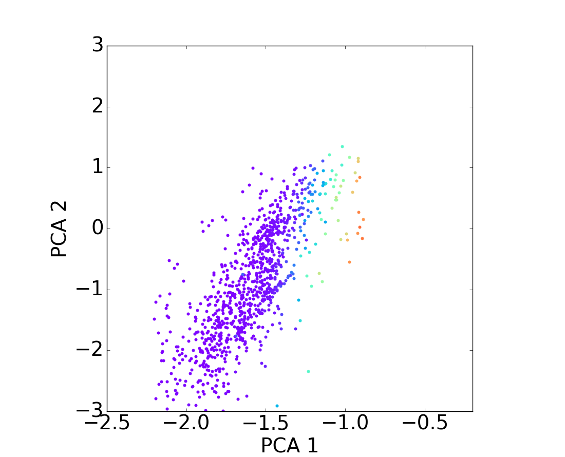 Distribution of the mass of the galaxies on the PCA diagram through the different redshift bins. As above, figures on top row correspond to star-forming populations for different redshift bins and figures on the bottom to quiescent populations for the same redshift bins; and the color code matches the galaxy stellar mass taken from the COSMOS2015 catalog. From these figures, it is easy to notice a strong relationship between the first PCA component and the stellar mass.