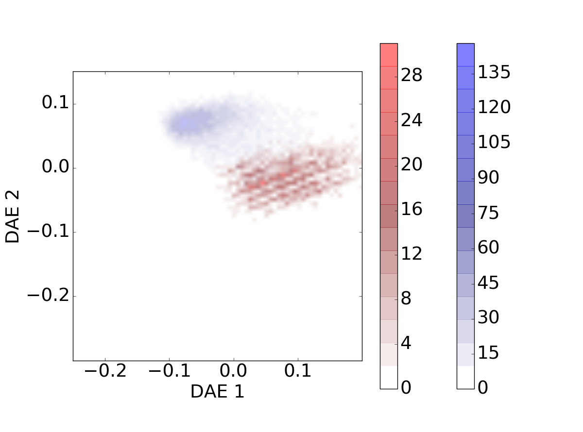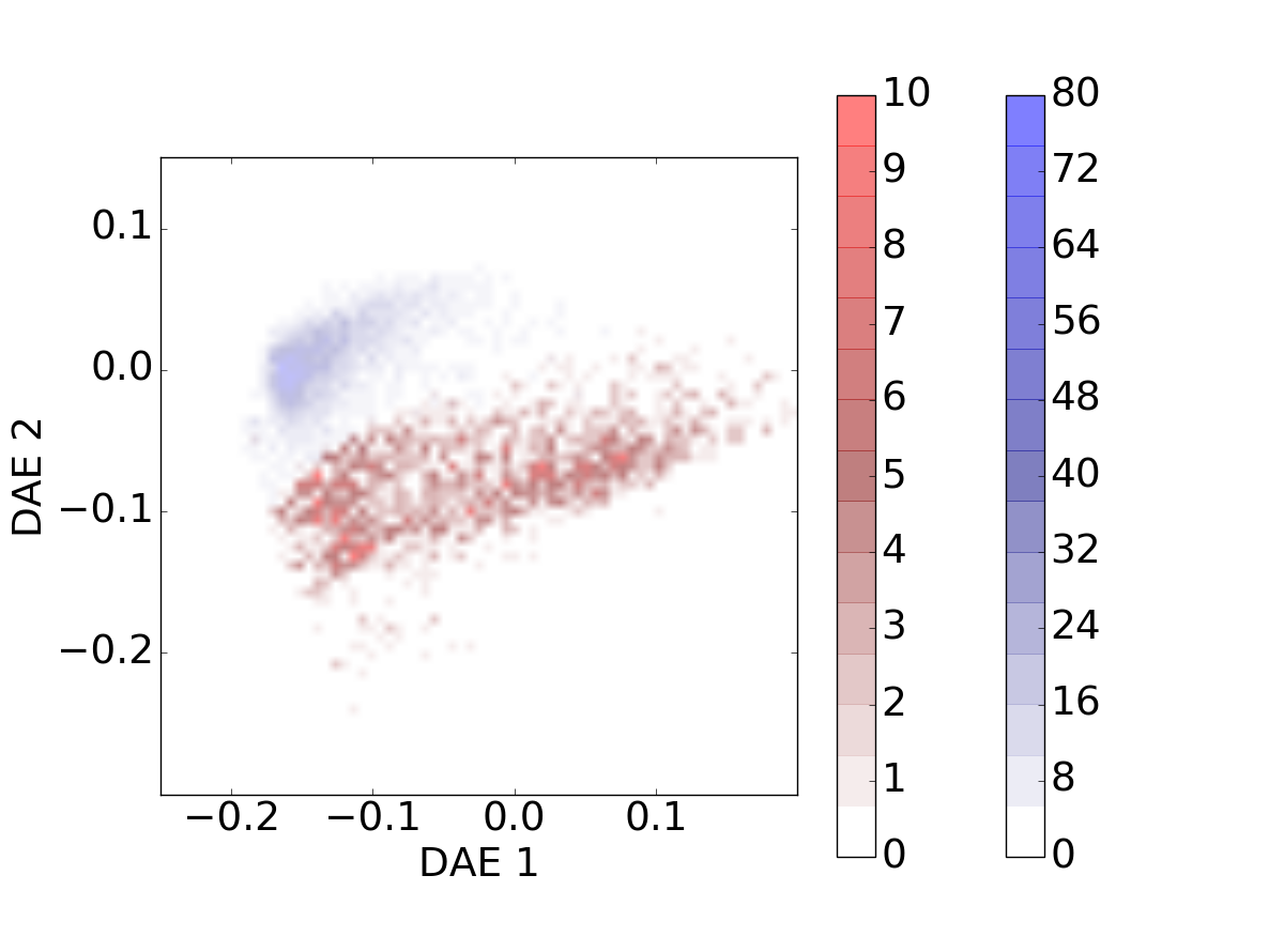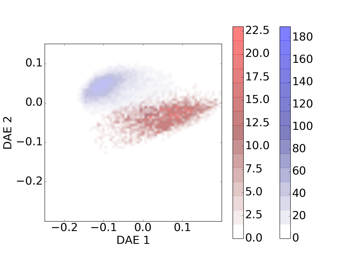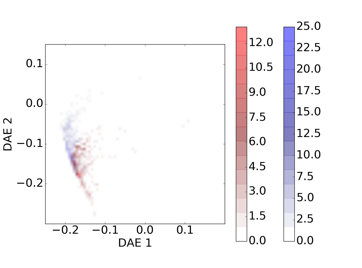 Evolution of the galaxies’ distribution for different redshift bins on the DAE diagram. The galaxies’ cloud progresses along the diagram as the redshift increases. The star-forming sources are represented in blue and quiescent sources in red.