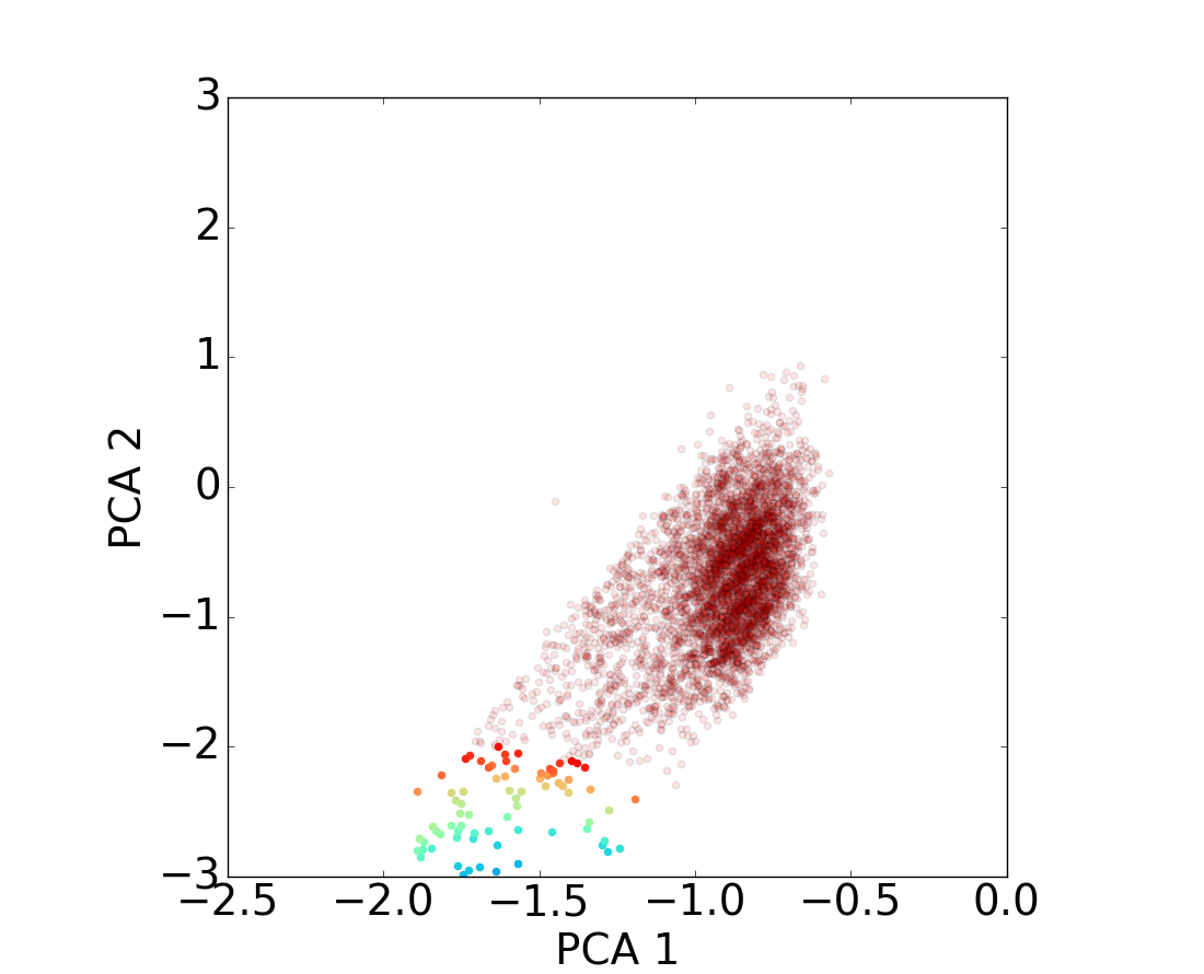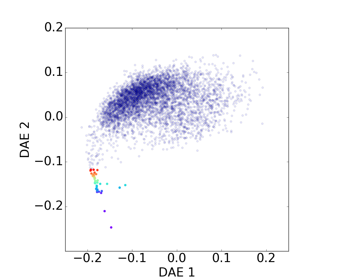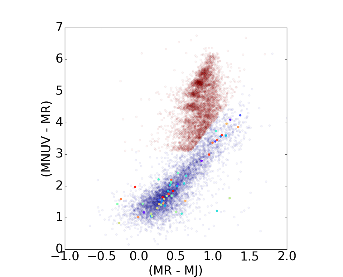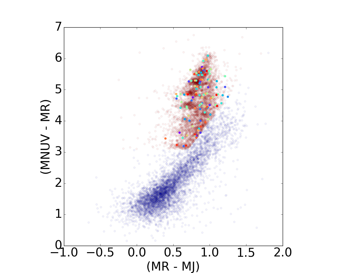 Projection of the structured queues identified in the DAE diagram, a) and b), back to the PCA diagram, c) and d), and to the RJ − NUVR diagram, e) and f). Top figures display star-forming populations in blue a) and quiescent sources in red b) for the test set. Galaxies located in the queues are highlighted on the DAE diagram and projected back to the PCA diagram and to the RJ − NUVR plane following the same color code. It is clear that these structures do not correspond to a particular disposition on the RJ − NUVR diagram and that they present a similar pattern on the PCA and DAE diagrams.