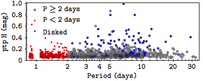 Top: period vs. ptp H amplitude for periodic stars. Bottom: median H magnitude vs. ptp amplitude H for periodic stars. Stars with P< 2 days are shown as red dots; stars with P ≥ 2 days are shown as gray dots; and disk-bearing periodic stars are shown as blue dots.