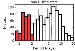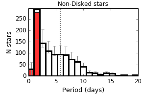 Period distributions for periodic disk-bearing stars with P ≤ 20 days (top) and periodic non-disk-bearing stars with P ≤ 20 days (bottom) for both linear and logarithm distributions. The median value for P ≥ 2 days stars is shown as dotted line. There were 80 disk-bearing stars and 799 non-disk-bearing stars with P ≥ 2 days and P< 20 days. The red bins show the fast rotators with P< 2 days excluded from the analysis.