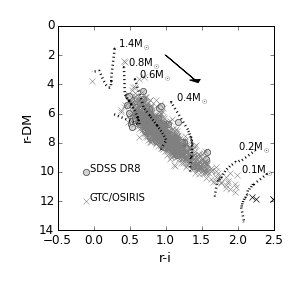 Top: histogram with mass distribution for periodic stars. Bottom: r − i vs. r-DM CMD for periodic stars. Mass tracks from Bell et al. (2014) for Pisa models (Tognelli et al. 2012) with semi-empirical corrections are shown as dotted lines. A black arrow shows a reddening vector from Schlegel et al. (1998) for AV = 2m. Black Xs show stars excluded from the mass estimation because they were too far away from the minimum mass track.