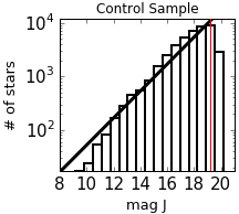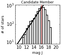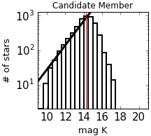 Magnitude distributions for the control sample (left) and candidate member sample (right) for J, H, and K filters.