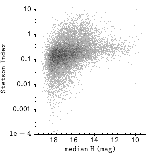 Distribution of 3-band Stetson variability index vs. mean H magnitude. Top: 36 365 objects from control sample with 3 band light curve. Higher density of points is shown as darker gray. Bottom: 5083 stars from the candidate member catalog. In both panels, the 3-band light curve is plotted as light gray dots, and darker gray shows regions with high density of points. The dashed red lines show the selection value S = 0.25. In the right plot, periodic stars are plotted in black.