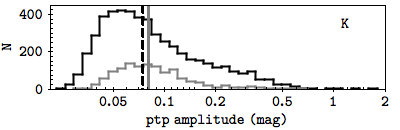 Ptp amplitude distributions for each band. Black: membership candidate catalog. Gray: periodic stars (Sect. 3.1). Black dashed lines show the median value for the member candidate sample: 0.094, 0.075, and 0.074 mag for J, H, and K band, respectively. Gray lines show the same for the periodic sample: 0.102, 0.087, and 0.080 mag.