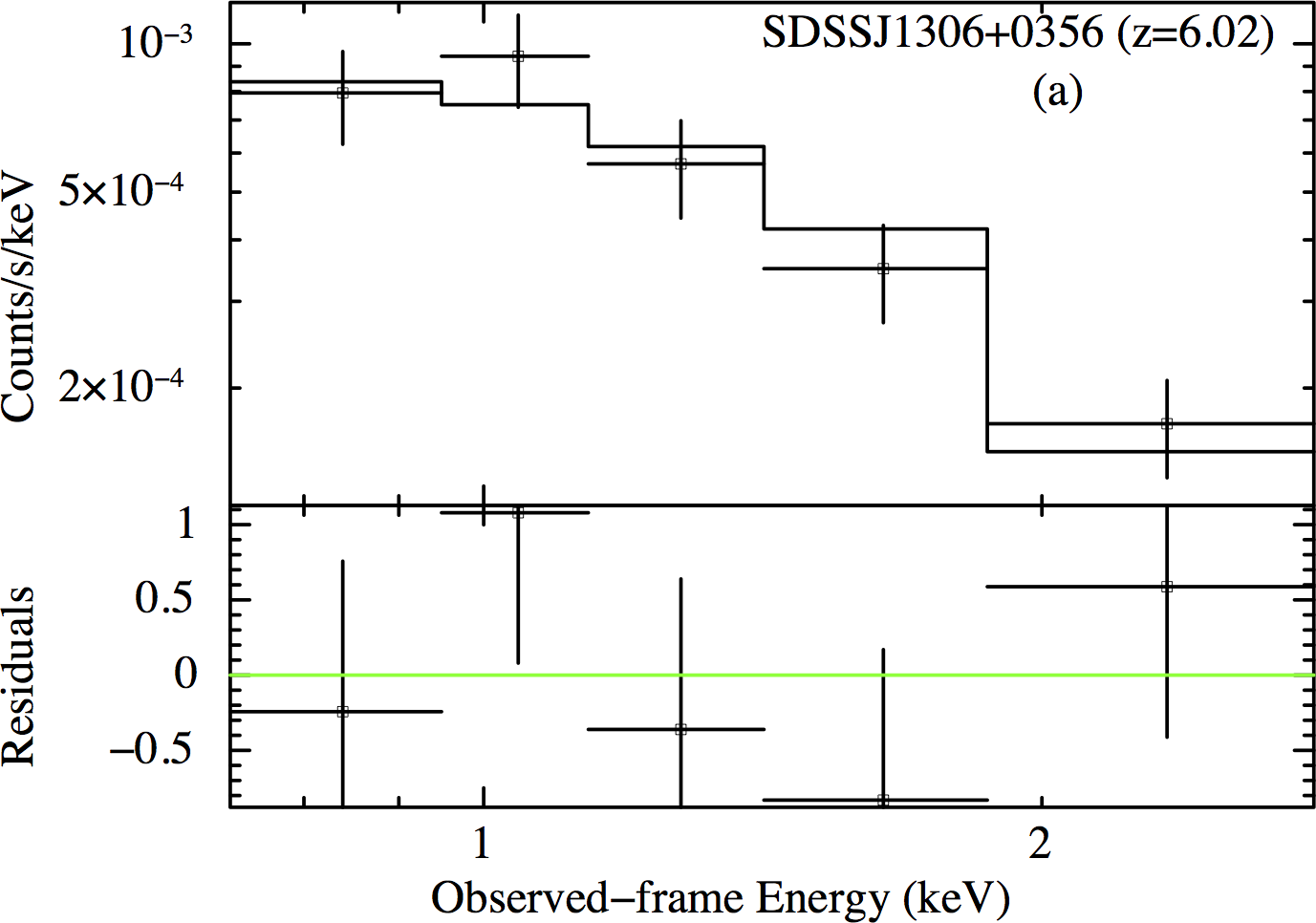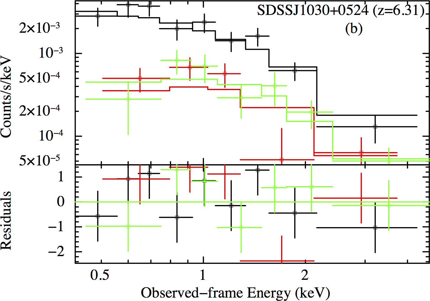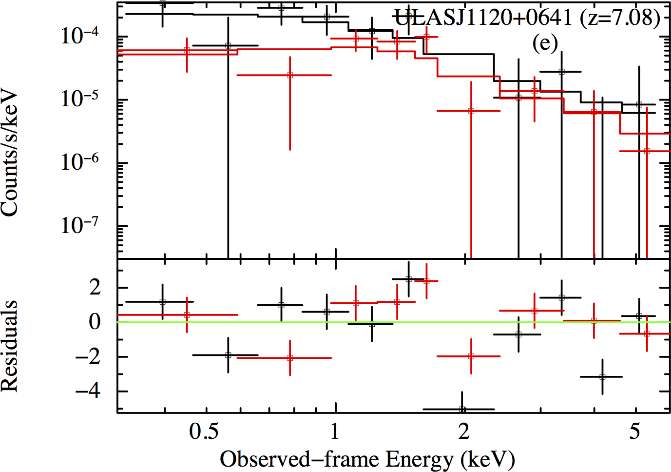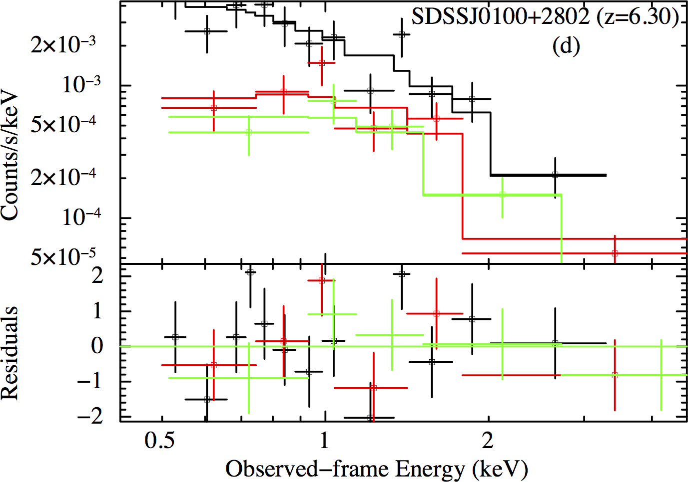 Spectra of the five AGN with the best counting statistics (34 ≤ net counts ≤ 148). Spectra in panels a) and c) are extracted from Chandra, while spectra in panels b), d) and e) are from XMM-Newton. The a), b) and d) spectra are fit by a power-law model with Galactic and intrinsic absorption; the c) and e) spectra are fit by a simple power-law model plus Galactic absorption. The black, red, and green points and lines in the b) and d) panels correspond to pn, MOS1, and MOS2, respectively. The black and red points and lines in the e) panel correspond to pn and combined MOS1 and MOS2, respectively. For the sake of clarity, we display the spectra using a minimum binning of 20, 15, 3, 3 and 20 counts for each bin for J0100+2802, J1030+0524, J1120+0641, J1148+5251 and J1306+0356, respectively.