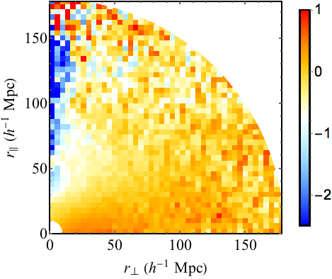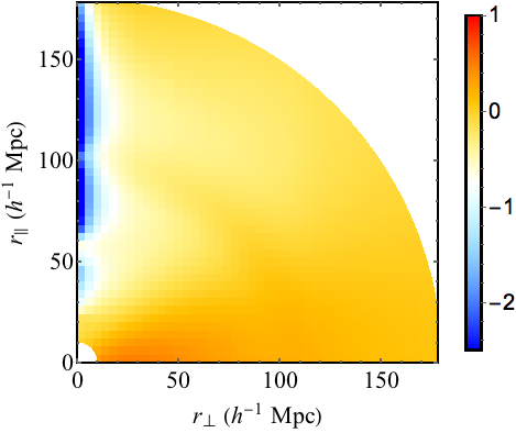 Two-dimensional representation of r2ξ(r⊥,r∥) in units of (h-1 Mpc)2. The right panel shows the measurement and the left panel the best-fit model, ξph, modified by the distortion matrix via Eq. (18). The BAO feature is at r ~ 100 h-1 Mpc. The effects of metal-Lyα correlations are seen in the lowest r⊥ bin, in particular the peak at 50 <r∥< 70 h-1 Mpc due to SiIIa and SiIIb.