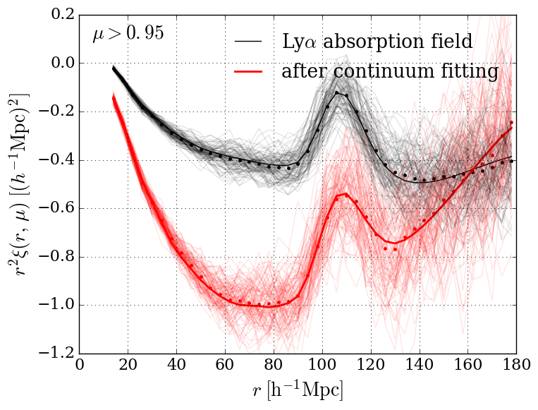 Correlation function for the metal-free mocks in four ranges of μ. The black points and curves correspond to mocks with Lyα absorption but without the addition of a quasar continuum. The red points and curves correspond to mocks with the addition of a continuum. The points correspond to stacks of 100 mocks and the light curves to individual mocks. The heavy curves correspond to the input model of Table 1 (after distortion by the matrix DAA′ (Eq. (10)) for the red curve).
