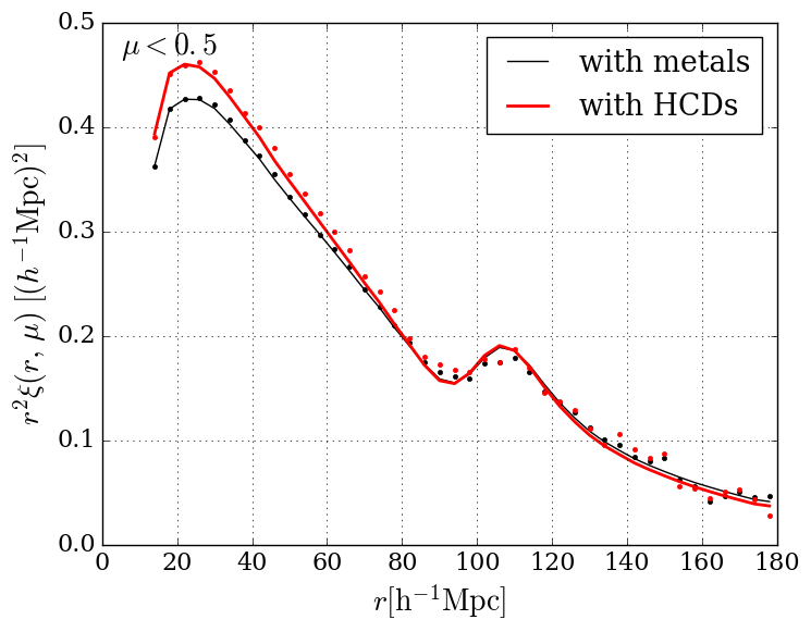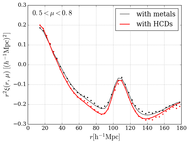 Correlation function for the stack of the 100 mocks in four ranges of μ. The red points represent the measured correlation function of the mocks with metals and the red curves shows the best fit. The black points indicate the correlation function after including, in addition to metals, HCDs unmasked for NHI< 1020 cm-2 and the black curve the best fit. The peak at r ~ 60 h-1 Mpc due to SiIIa and SiIIb is apparent in the range μ> 0.95 but not in the range 0.8 <μ< 0.95.