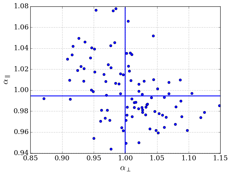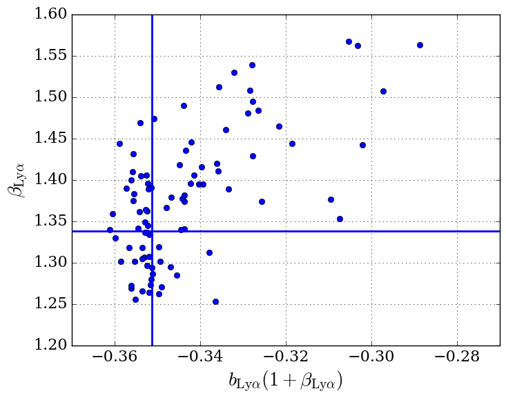 Measured α⊥ and α∥ (left) and βLyα and bLyα(1 + βLyα) (right) for the 100 mock catalogs including HCDs with NHI> 1020 cm2 masked. There are four outliers on the left plot and two on the right. The horizontal and vertical blue lines show the weighted means of the distributions, also given in Table 4. The distribution and mean values of (α⊥,α∥) indicates no significant bias in the reconstruction of the BAO peak-position parameters.