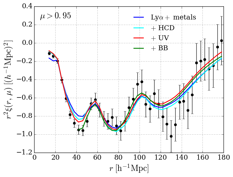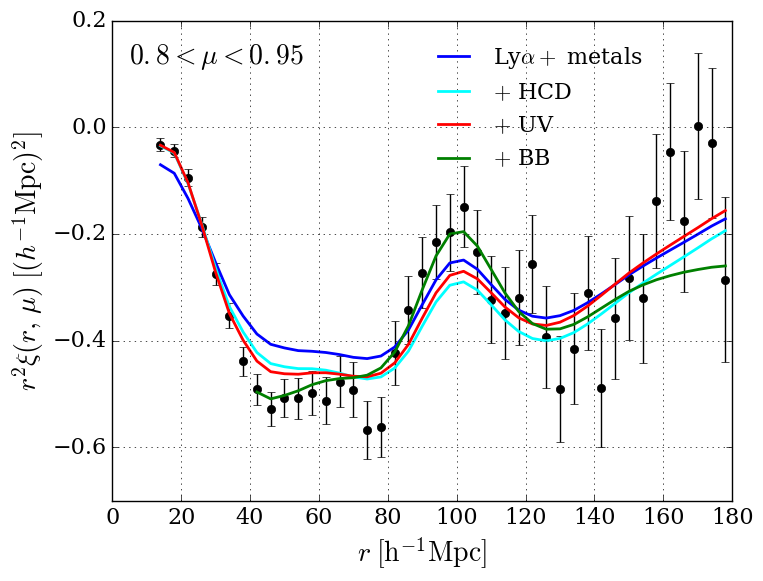 Measured correlation function in four ranges of μ. The most radial range (top-left μ> 0.95) has, in addition to the BAO peak at ~100 h-1 Mpc, a peak at ~60 h-1 Mpc due to correlated absorption by Lyα and SiIII(119.0,119.3) at the same physical position. In the next radial bin (top-right, 0.8 <μ< 0.95) only the BAO peak is visible. The lines show fits including successively Lyα and metal absorption, unidentified HCDs absorption, UV flux fluctuations, and a (imin,imax,jmax) = (0,2,6) broadband (BB).