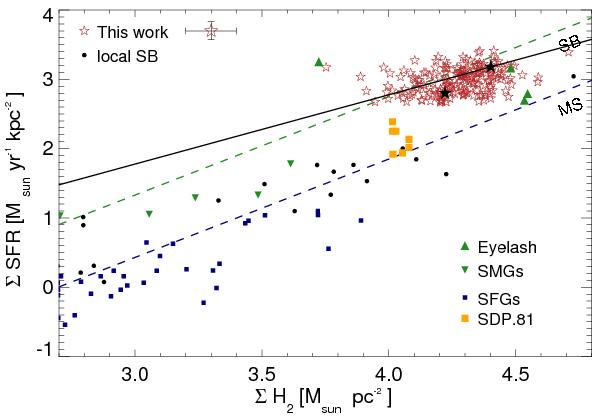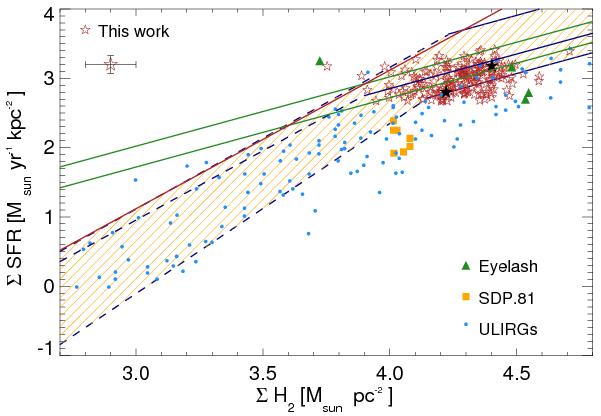 Left: spatially resolved Schmidt-Kennicutt law in PLCK G244.8+54.9 (red stars) and best fit relation (solid black line). The lower and upper black star indicate the luminosity-weighted average position of images #2.1 and #1.1, respectively. Other symbols indicate: submillimeter galaxies at z ~ 2 (green upside-down triangles, Bothwell et al. 2010), local starbursts (black circles, Kennicutt 1998), spatially-resolved data from the Eyelash (dark green triangles Swinbank et al. 2011) and SDP.81 (yellow squares, Hatsukade et al. 2015). The green and dark blue dashed lines indicate the Schmidt-Kennicutt relationship for high-z starburst galaxies and main sequence galaxies of Daddi et al. (2010), respectively. All star-formation rates are given for a Chabrier initial mass function, and are a factor 1.8 lower than in many other figures showing the Schmidt-Kennicutt relationship (see text for details). Right: same Schmidt-Kennicutt diagram, showing the position of maximum starbursts in several models, and the position of the Ruby relative to them. Light blue circles indicate nearby Eddington-limited starbursts (Andrews & Thompson 2011). The dark green solid lines show the mechanical input from stellar winds and supernova remnants for 100% and 50% efficiency, respectively. The dark blue lines and yellow hatched region show the models of Andrews & Thompson (2011) for an Eddington-limited starburst with a range of opacities between 10 and 30 cm2 g-1. Solid lines show the optically thick limit above the critical gas-mass surface density for the optically thick case, dashed lines the optically thin case below that limit. The solid blue line shows the relationship of Ostriker & Shetty (2011), also for optically thick and optically thin gas. The red line shows the model of Faucher-Giguère et al. (2013).