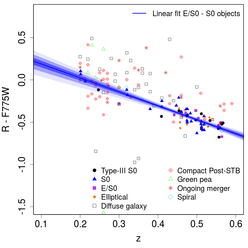 Left panel: estimated K-correction for the F775W filters to the R band as a function of z. It is important to highlight that the linear fit applies to the observed correlation of the S0 and E/S0 galaxies of the sample. The intensity levels of the linear fit represent the 1, 2 and 3σ confidence regions of the fit. Right panel: stellar mass for the initial red sequence sample vs. z. Consult the legend in the figure for the morphological classification.