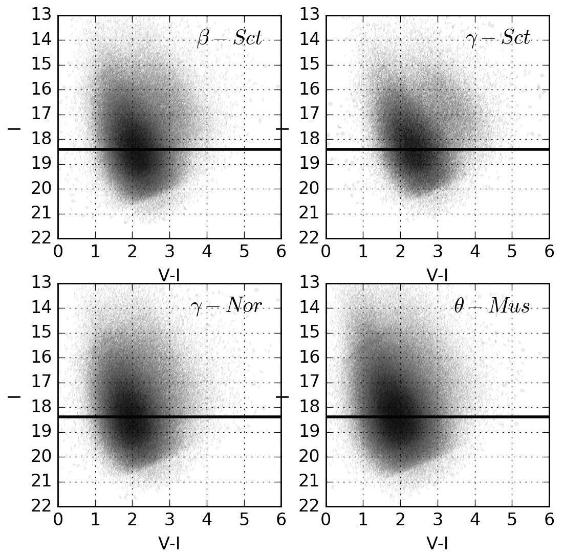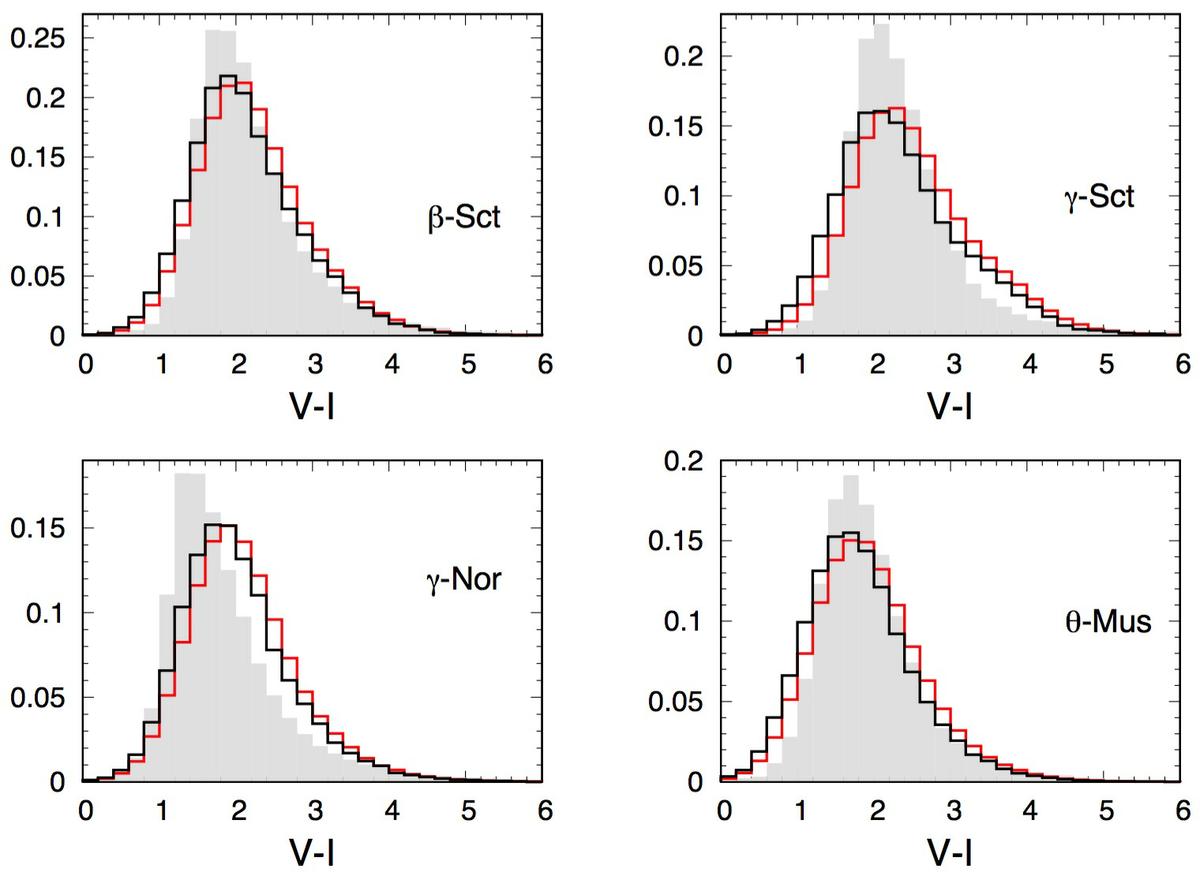 Simulated CMDs toward the 4 monitored directions (top) with the magnitude (middle) and color (bottom) projections for the stars brighter than I = 18.4, expressed in million of stars per square degree per magnitude. Results from our simple model are plotted with black lines and results from the Besançon model with red lines; the distributions of the EROS observed populations of bright stars (I< 18.4) are superimposed on the projections as light gray histograms.