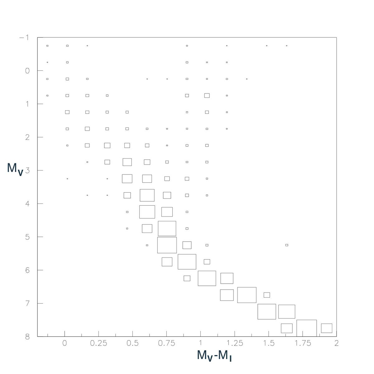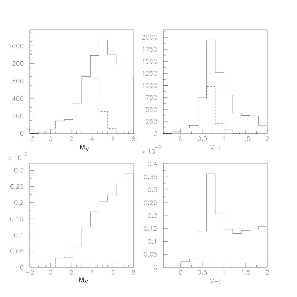 Top: raw distributions of MV and (V − I) of all Hipparcos stars within 50 pc (6911 objects). The dashed lines show the numbers of stars within the completion volume corresponding to their magnitude (see text). Middle: local debiased volumic density of stars (per magnitude unit, in pc-3) estimated from the ratio of stars within the completion volume and extrapolated beyond MV = 6. Bottom: debiased MV vs. V − I stellar density of stars closer than 50 pc.