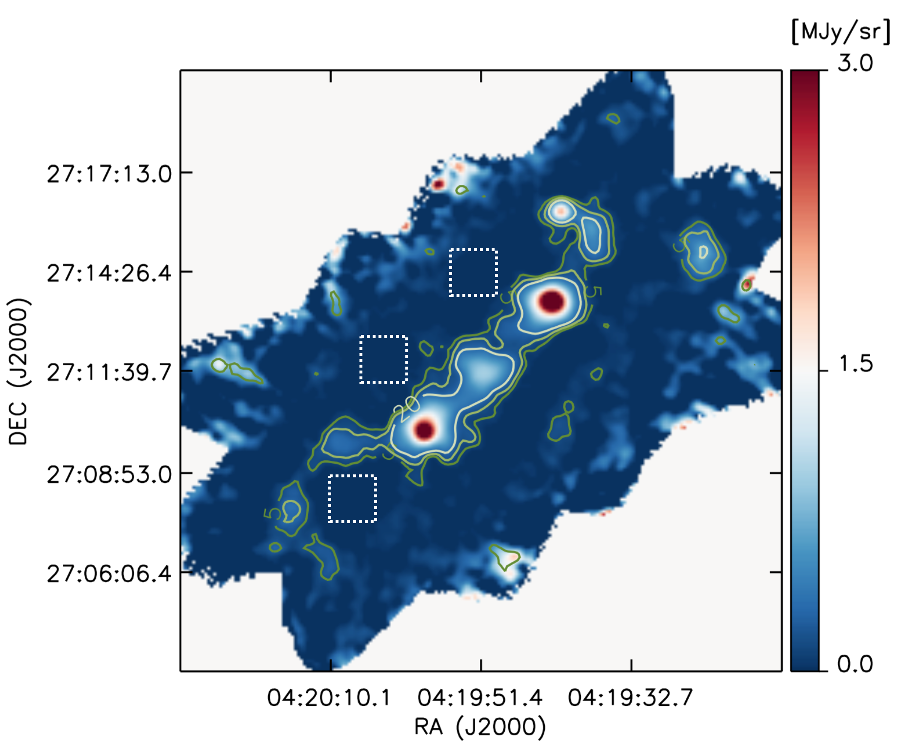 Dust continuum maps of a portion of the B213 filament obtained with the NIKA camera on the IRAM 30 m telescope at 1.15 mm (left panel) and 2 mm (right panel). The two maps are shown after smoothing to a common resolution of 24′′ (see the circle in the bottom-left corner of the left panel). The green contours represent the signal-to-noise ratio levels (5, 10, 20) at each wavelength. The labels in the left panel correspond to the sources analyzed in this work, which are listed in Table 1. The three squares on the right delimit the regions where we estimate the rms intensity of the two maps at 24′′, which corresponds to 0.75 MJy/sr and 0.09 MJy/sr at 1.15 mm and 2 mm respectively.