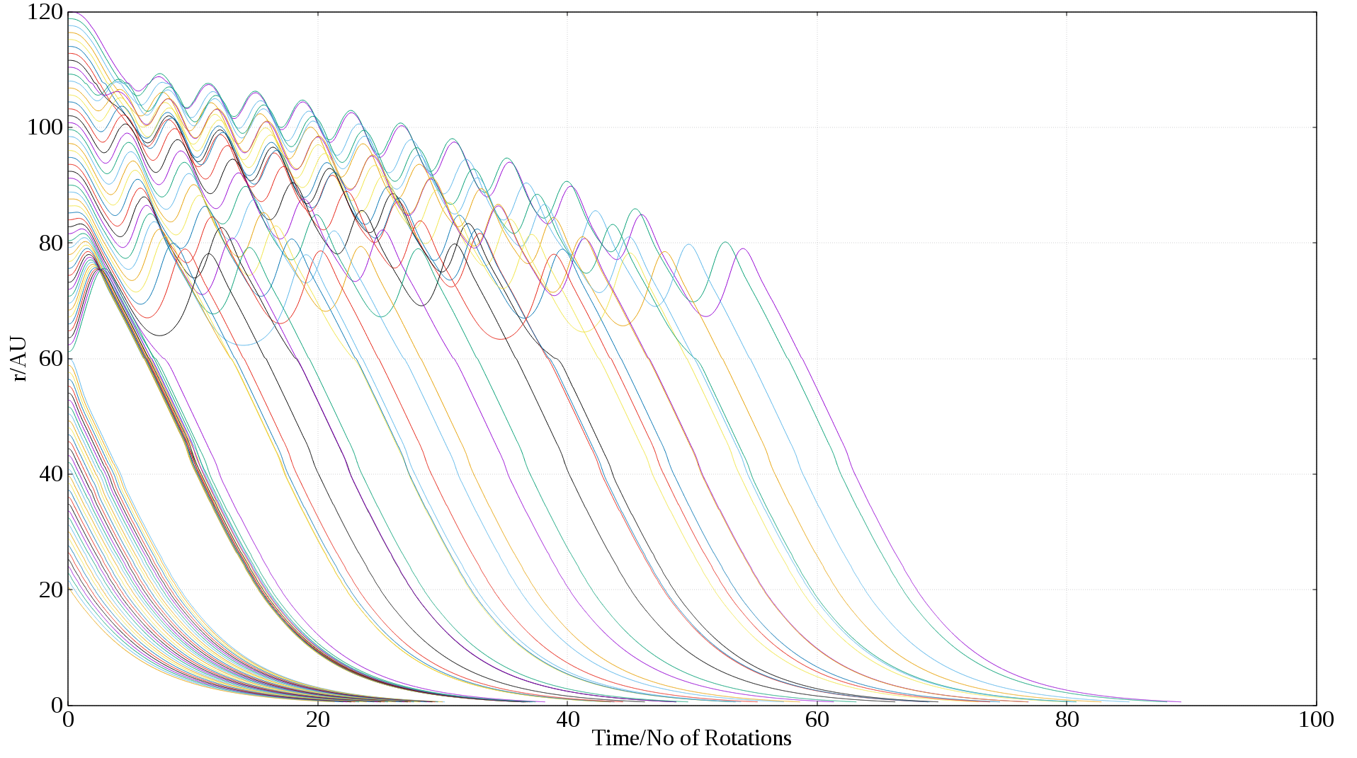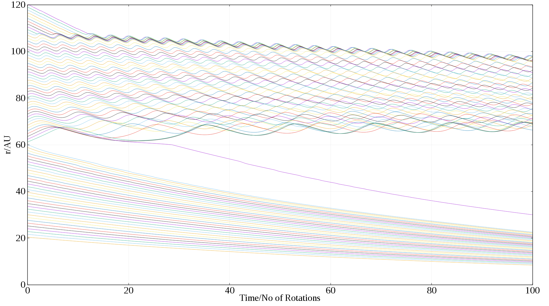 Radial drift of solid particles interacting with spiral+vortex (time is in number of vortex rotations). Particle size is 0.32 mm and 6.4 mm, from top to bottom. The various curves are for different values of the impact parameter.