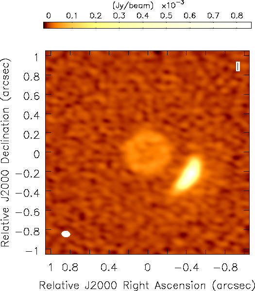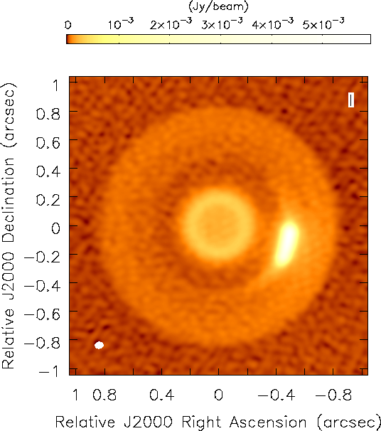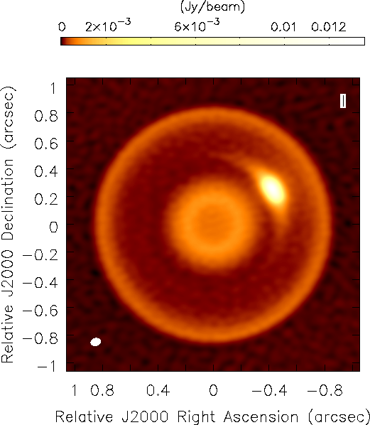 Simulated ALMA images computed from the disk simulations illustrated in Fig. 1. Each map corresponds to a single particle size: 0.14 mm (wavelength of the simulated observations of 0.43 mm), 0.32 mm (λ = 0.87 mm), 0.74 mm (λ = 1.3 mm), and 1 mm (λ = 2.7 mm), from left to right and from top to bottom.