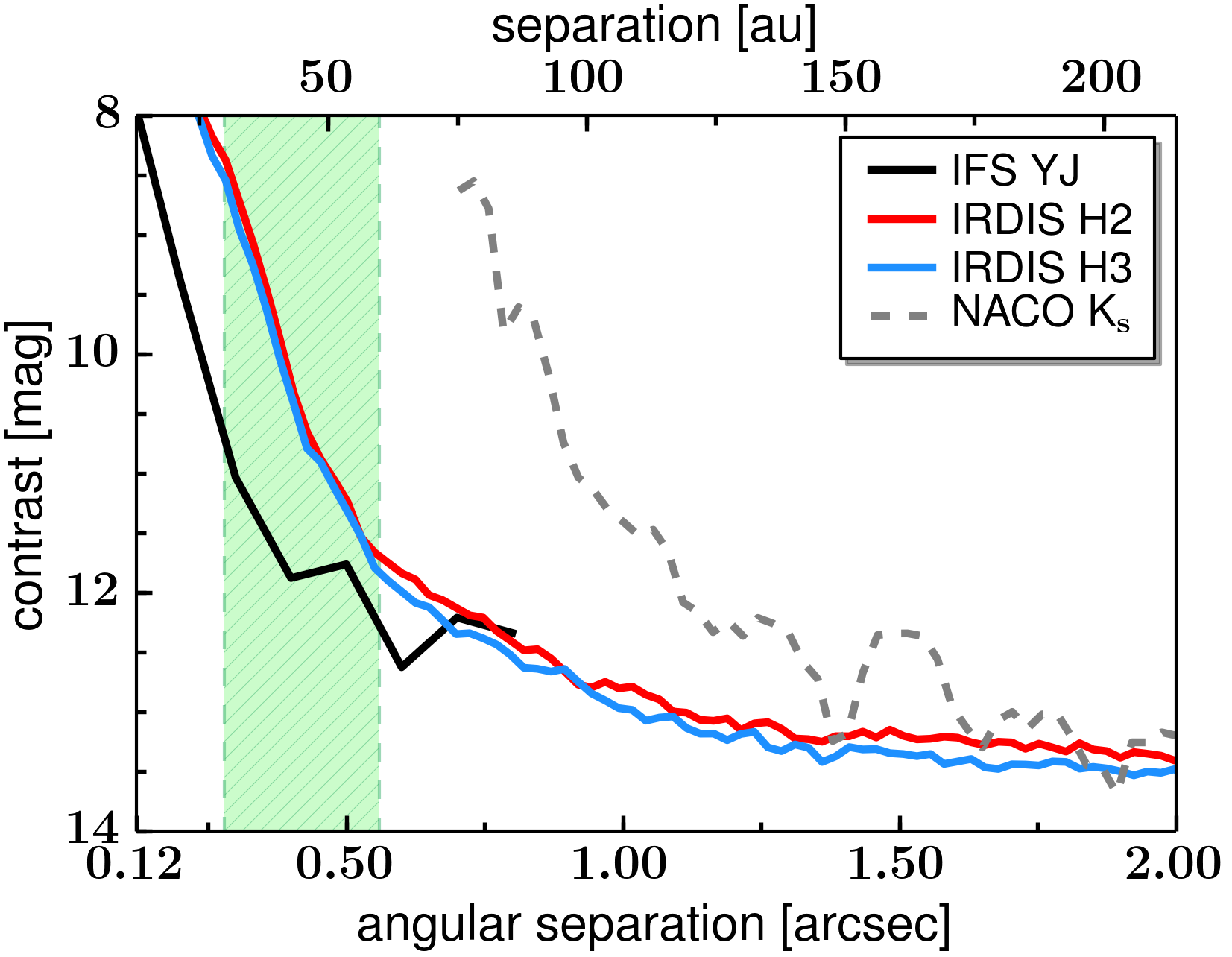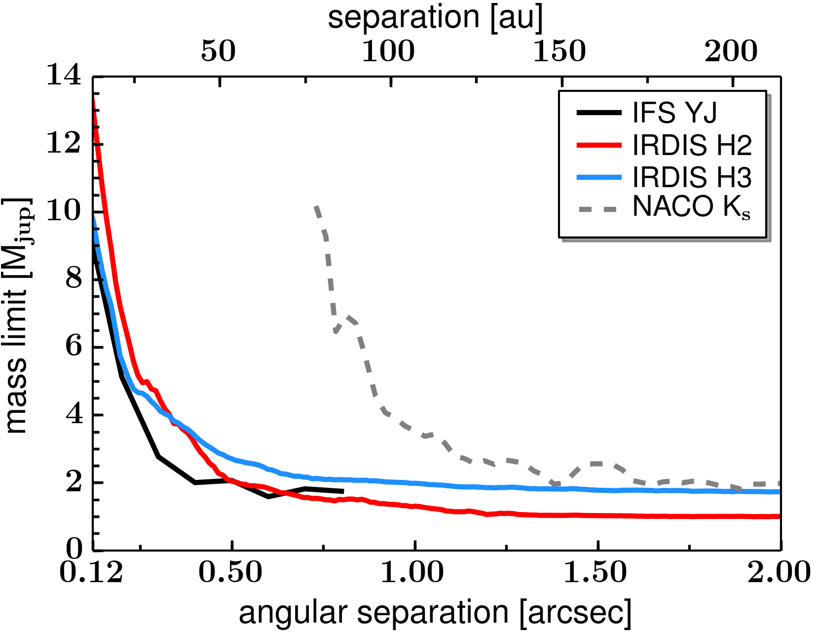 Contrast curves and companion mass limits derived for IFS (black) after applying PCA, and for IRDIS H2 and H3 bands (red and blue, respectively) from the TLOCI reduction (#3). Both curves have a lower cut at 0.̋12. The detection limits from NACO Ks band data are given for comparison (gray dashed line, inner cut at 0.̋7). The green striped rectangle denotes the area for which the contrast values might be slightly affected by the presence of the disk in scattered light.