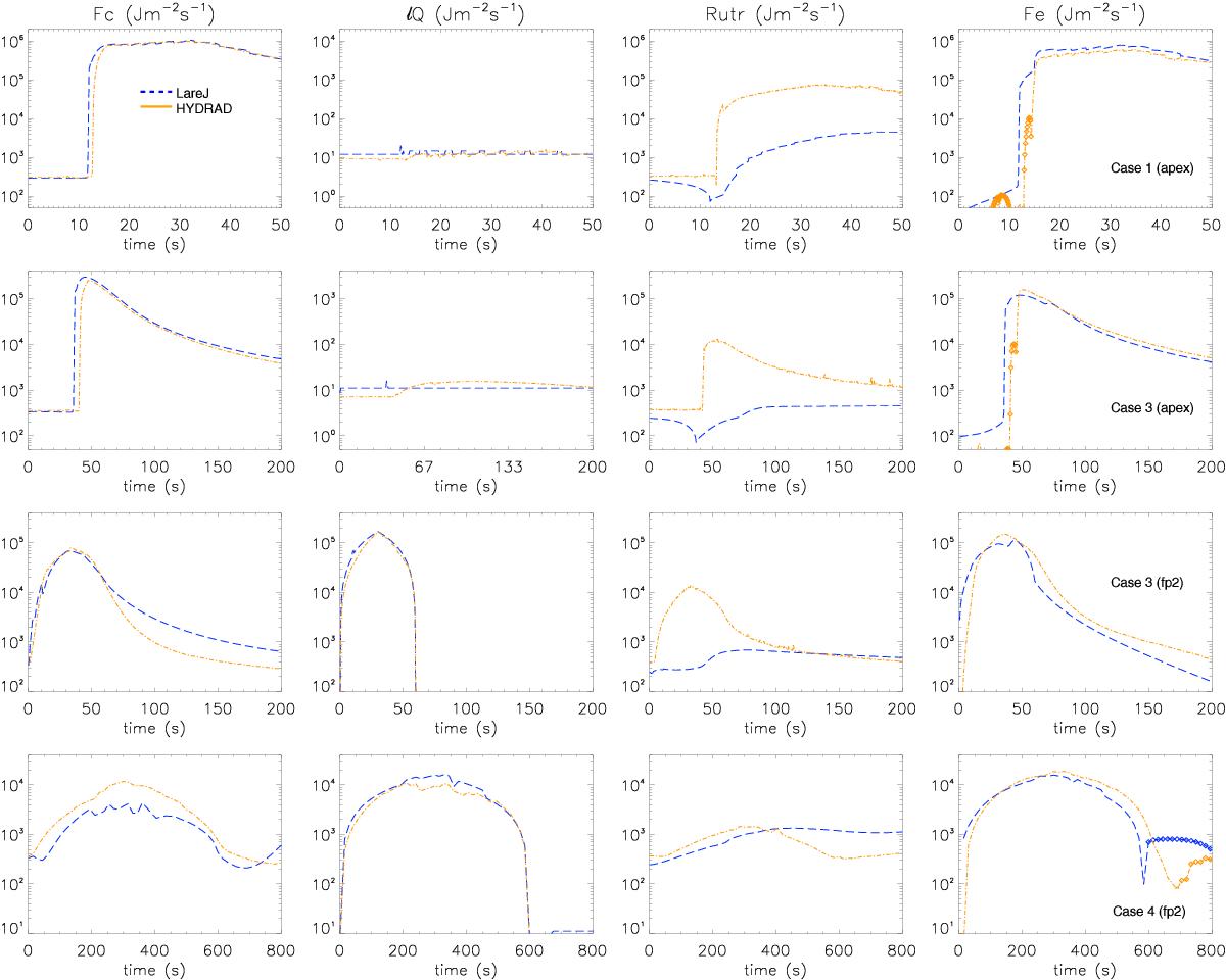 Comparison of the dominant quantities in the UTR jump condition obtained from the HYDRAD and LareJ solutions. Rows 1, 2, 3 and 4 correspond to Case 1 apex, Case 3 apex, Case 3 fp2 and Case 4 fp2 heating, respectively. From left to right the columns show the heat flux at the top of UTR (Fc,0), volumetric heating rate in the UTR (), IRL in the UTR (ℛutr) and enthalpy flux at the top of the UTR (Fe,0, lines connected by diamond symbols indicate where the enthalpy flux is downflowing and lines without diamonds indicate where the enthalpy flux is upflowing). The upper two rows (Cases 1 and 3 apex heating) in the second column (