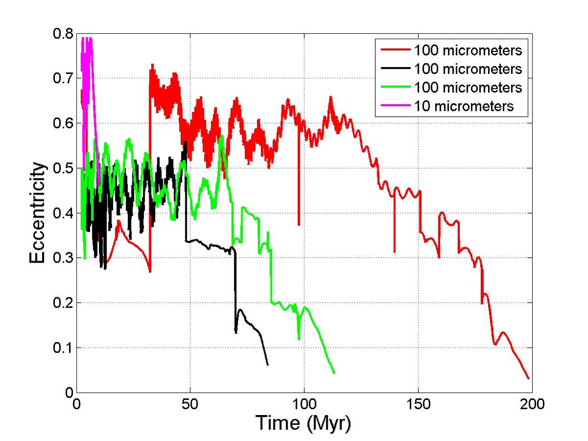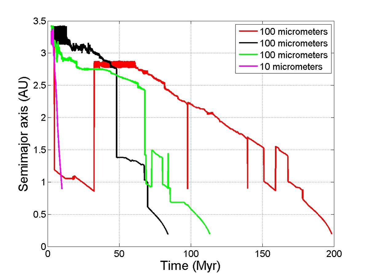 Typical dynamical evolution of cometary dust grains to be compared to that of asteroidal dust grains in Fig. 9. The fast evolution induced by PR-drag through the high eccentricity is frequently interrupted by close encounters with the terrestrial planets. Rare short-term resonant trapping with Jupiter is observed at the beginning of the dynamical evolution of dust particles. Smaller grains evolve toward the Sun on a timescale shorter than 10 Myr.