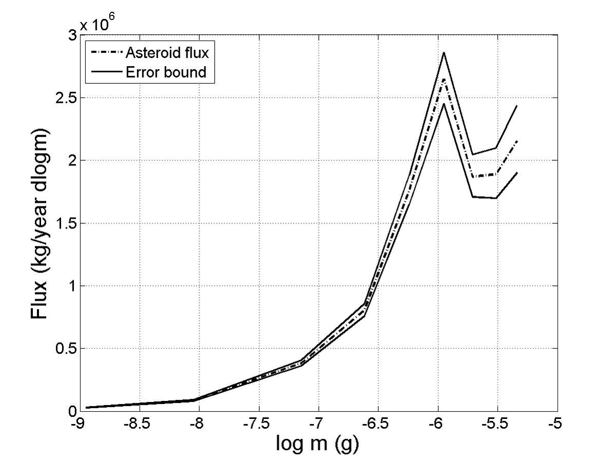 Panel a: Micrometeoritic flux on Mars in the radius range between 5−100 μm of impacting particles. Panel b: Velocity distribution function of particles impacting Mars.