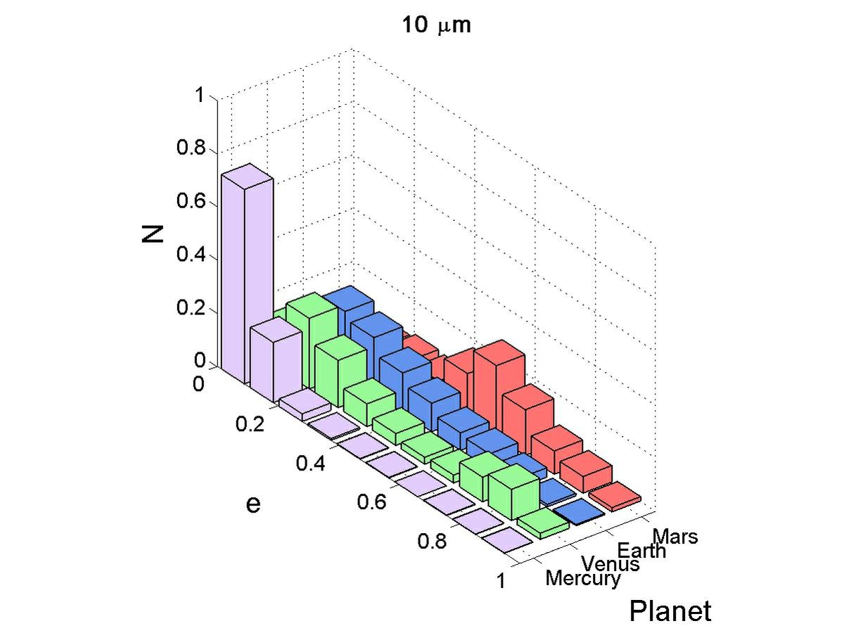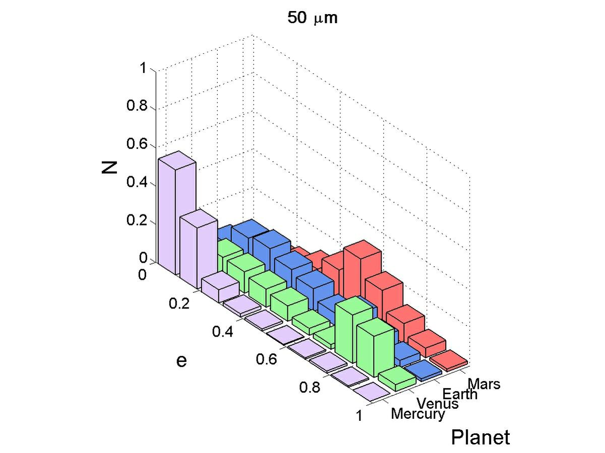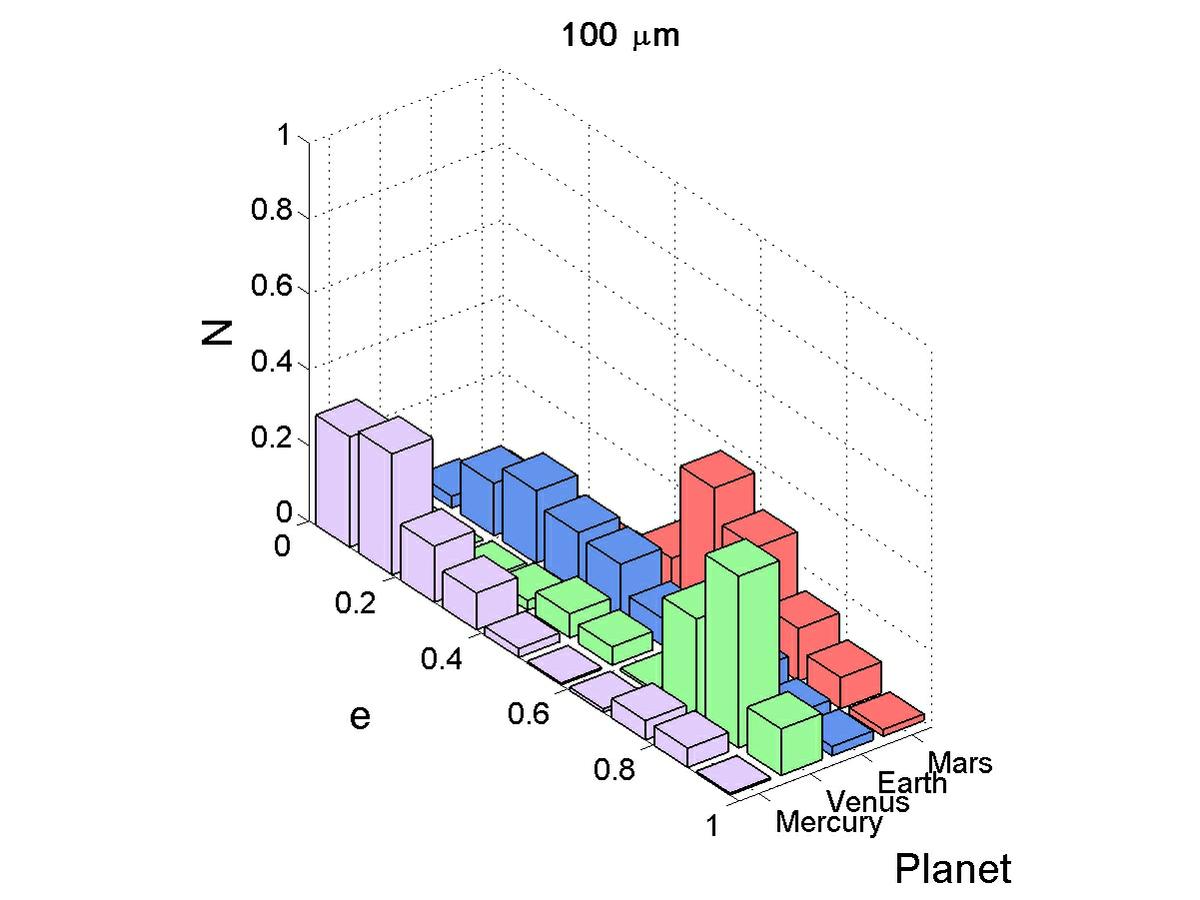Eccentricity distribution of cometary dust particles at the different planets for dust grains with radii of a) 10 μm; b) 50 μm; and c) 100 μm.