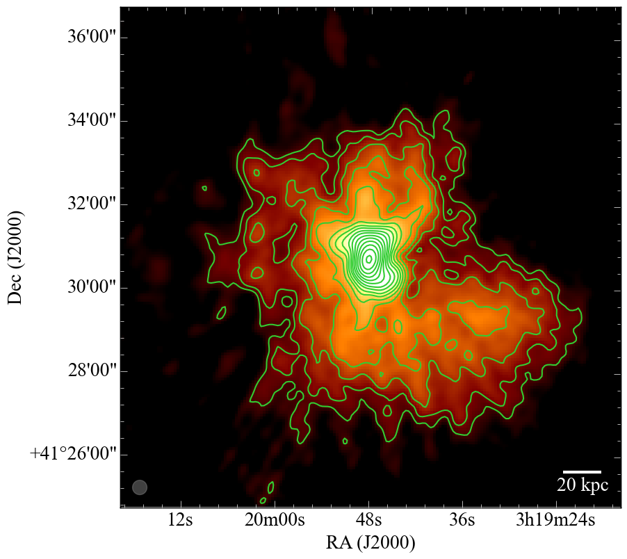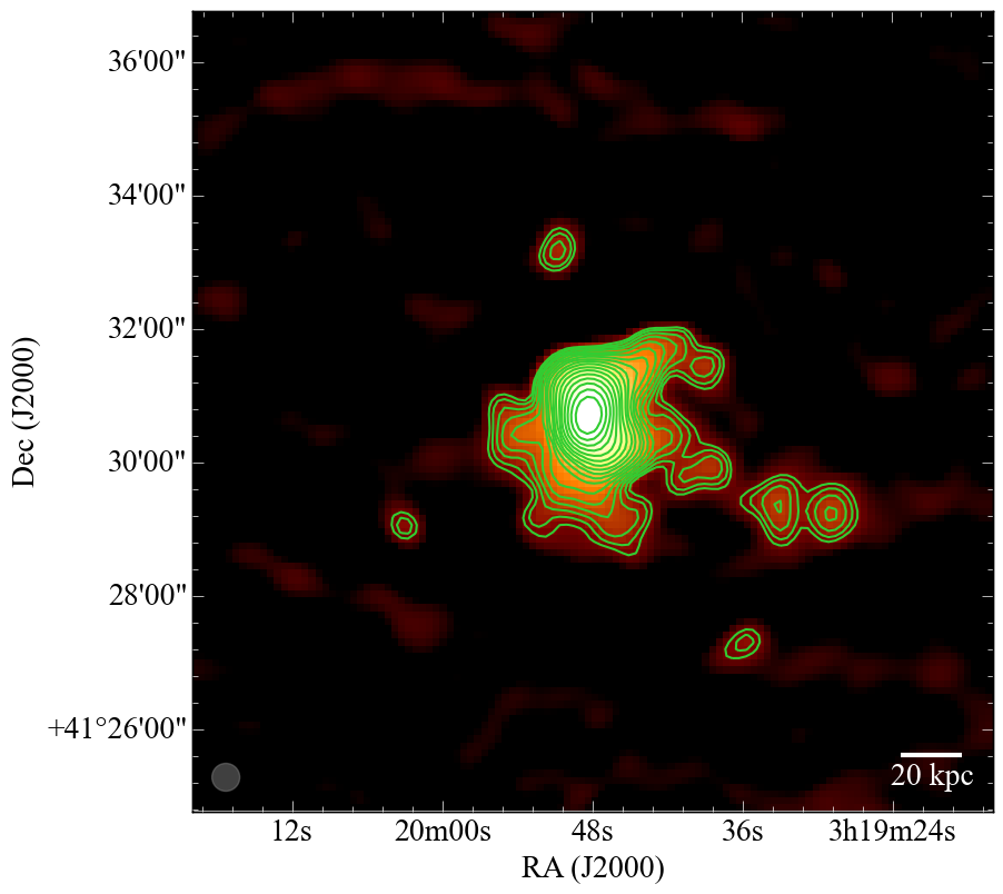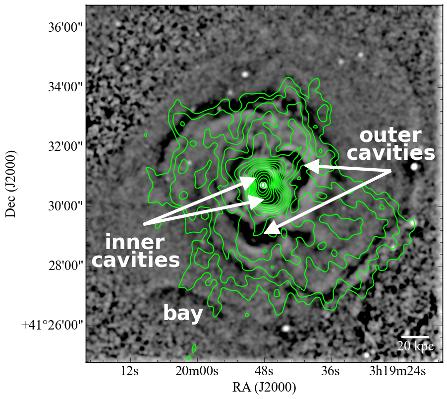 Perseus cluster. Top left: reprocessed MSSS map with resolution 20.8′′ × 20.8′′ and rms noise 20 mJy/beam. The contours start at 5σ level and are drawn at 100 mJy/beam × [1, 1.4, 2, 2.8, 4, 5.7, 8, 11, 16, 22, 32, 45, 64, 91, 128]. Top right: Chandra X-ray surface brightness residual map. The image is produced by unsharp masking using archival data in the 0.5–7 keV band with total exposure of 1.4 Ms after standard filtering. Contours correspond to the MSSS image. Bottom: TGSS map with resolution 25.0′′ × 25.0′′ and rms noise 10 mJy/beam. The contours start at 5σ level and are drawn at 50 mJy/beam × [1, 1.4, 2, 2.8, 4, 5.7, 8, 11, 16, 22, 32, 45, 64, 91, 128, 182, 256].