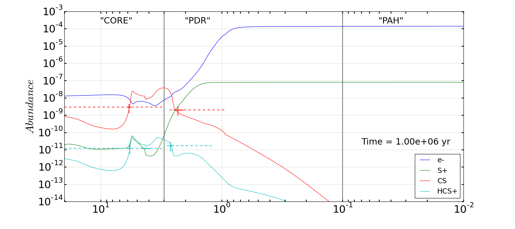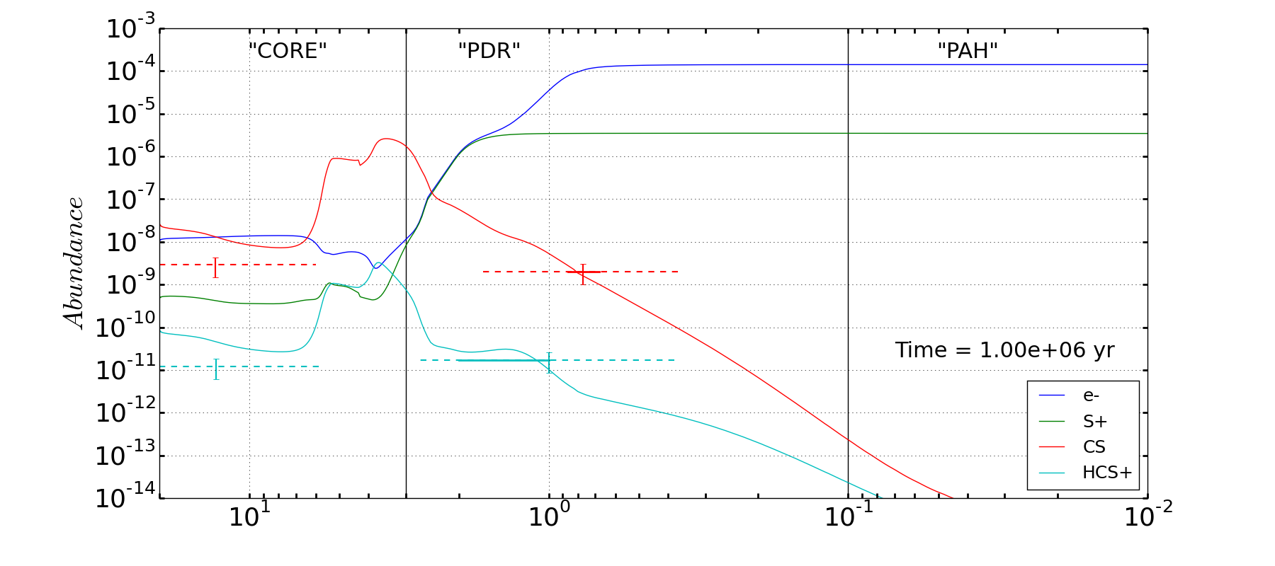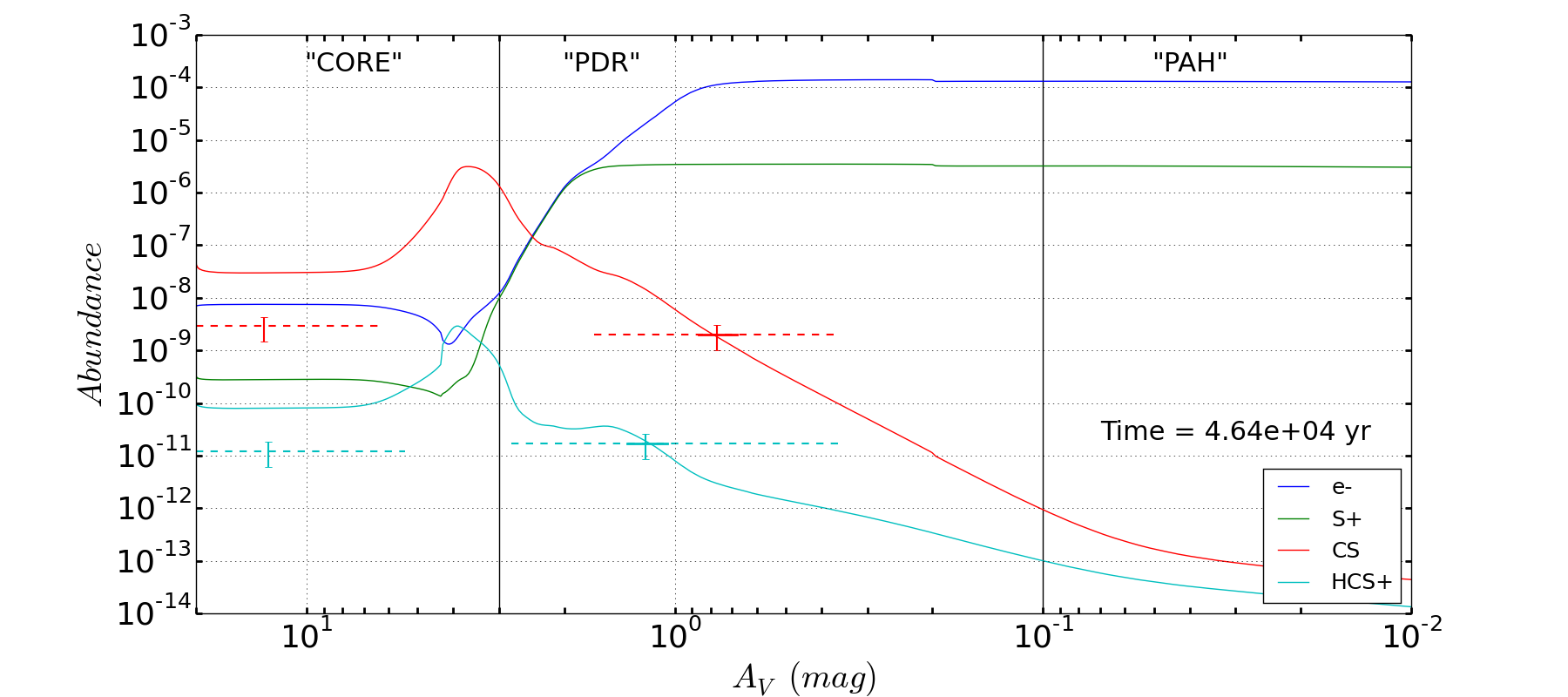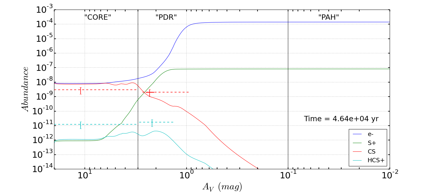 Same as Figs. 8 and 9 but here representing the predicted abundances for selected sulfur-bearing species for two different elemental amount of sulfur: a high elemental abundance of 3.5 × 10-6 in the left panels and low elemental abundance of 8.0 × 10-8 in the right panels (see Sect. 4.5). The error bars represent the observational values from Guzman et al. (2014).