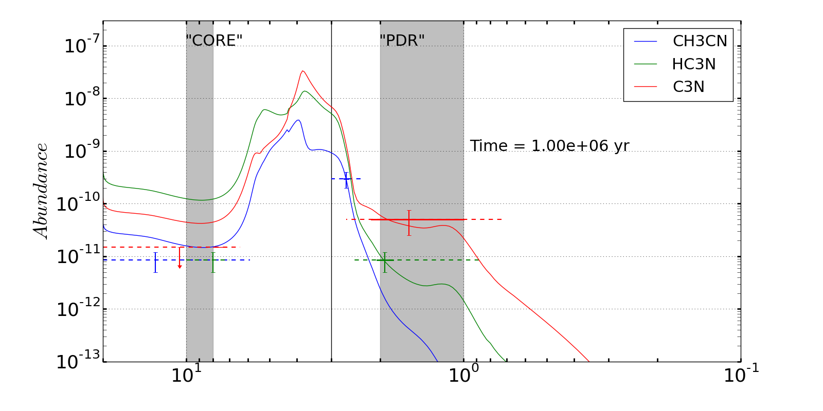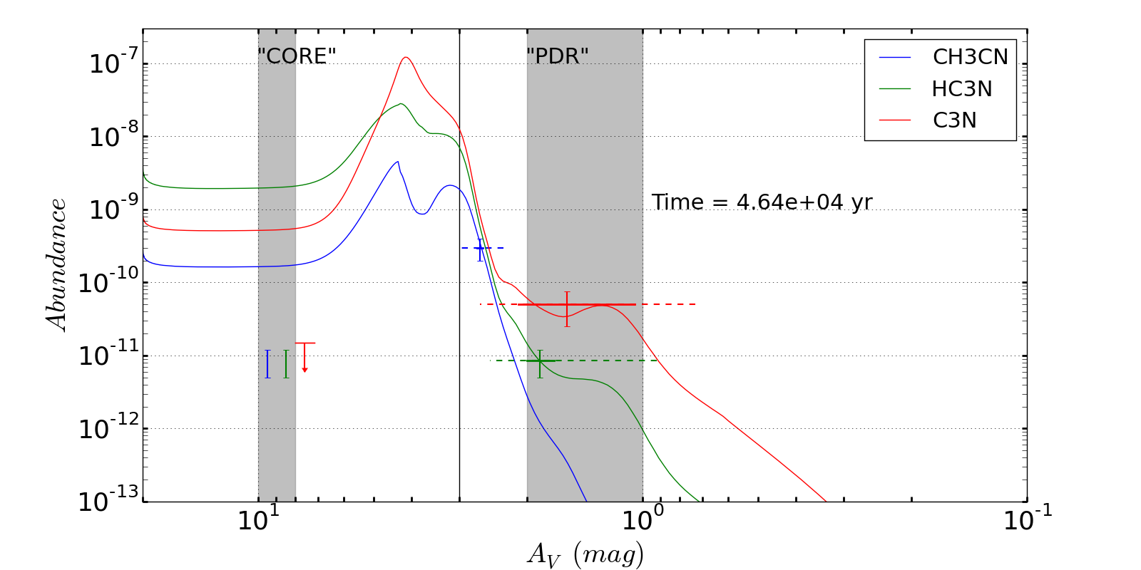 Same as Fig. 2 except that the nitrile abundances are shown and the error bars in the observations come from Gratier et al. (2013).