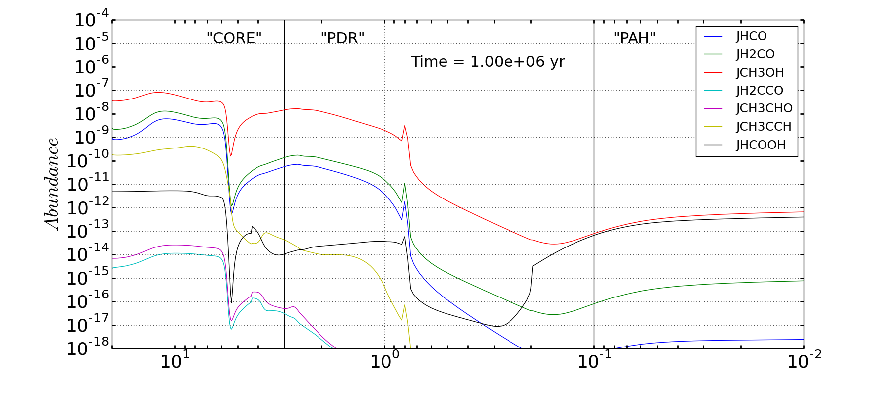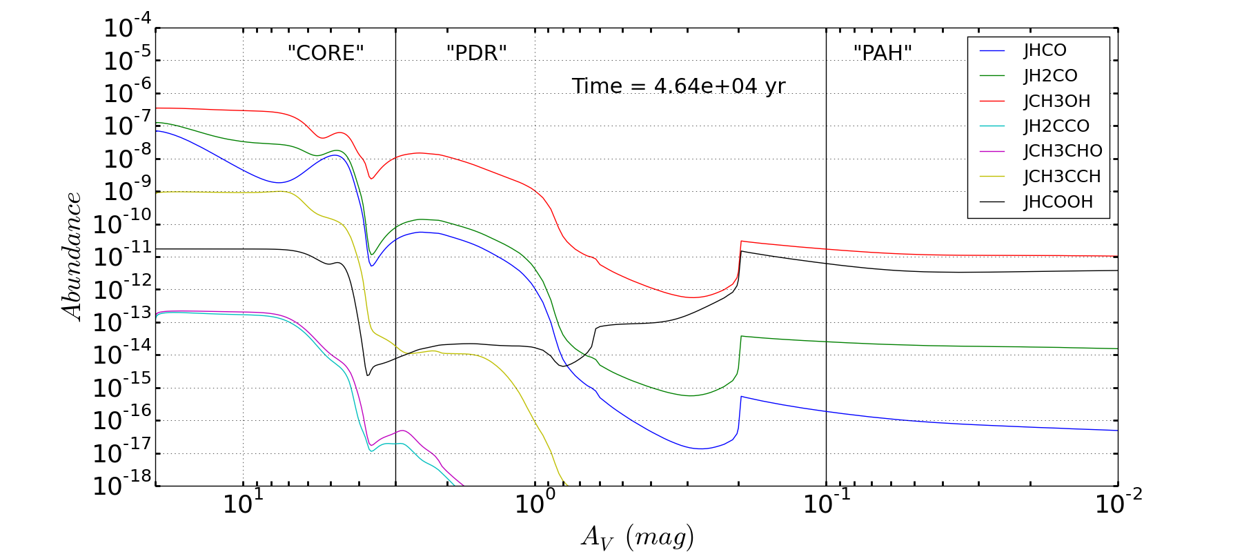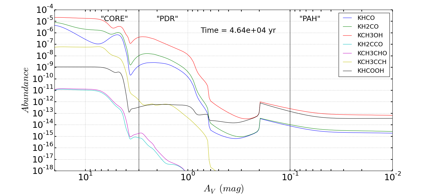 Same as Fig. 2 but here the abundances of the equivalent grain mantle-surface molecules (“Jspecies”) and grain bulk-mantle molecules (“Kspecies”) are depicted.