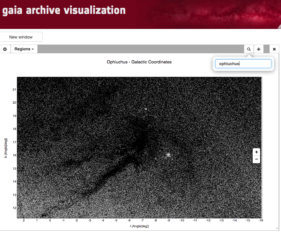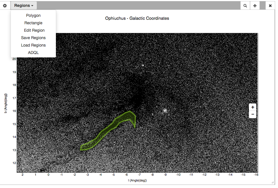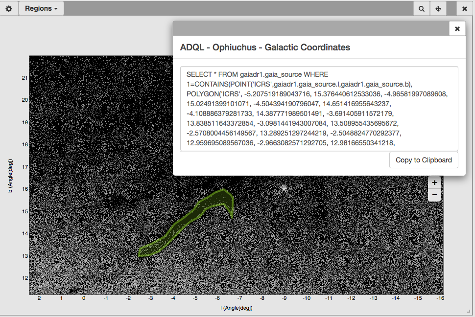 Workflow for producing a visual ADQL query. Top panel: user selects a region to centre the view (top). Middle panel: selected polygonal region is shown in green. Region menu with the ADQL functionality also displayed. Bottom panel: resulting ADQL query.