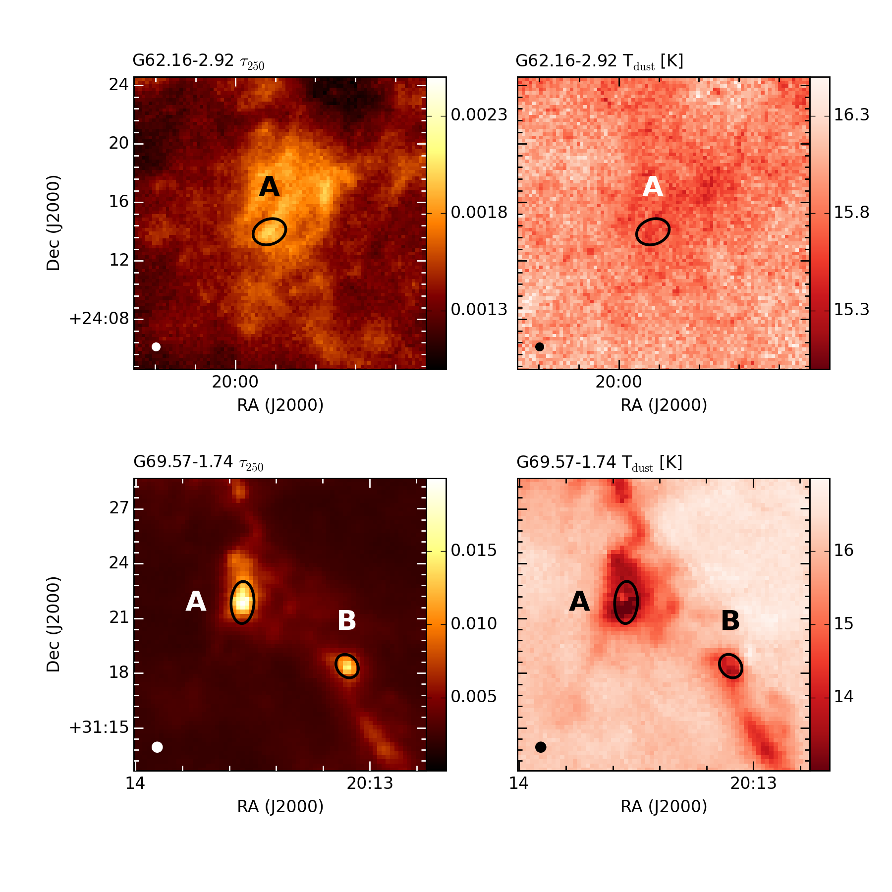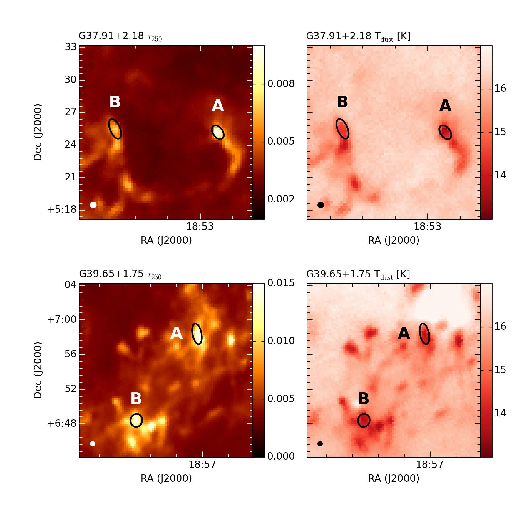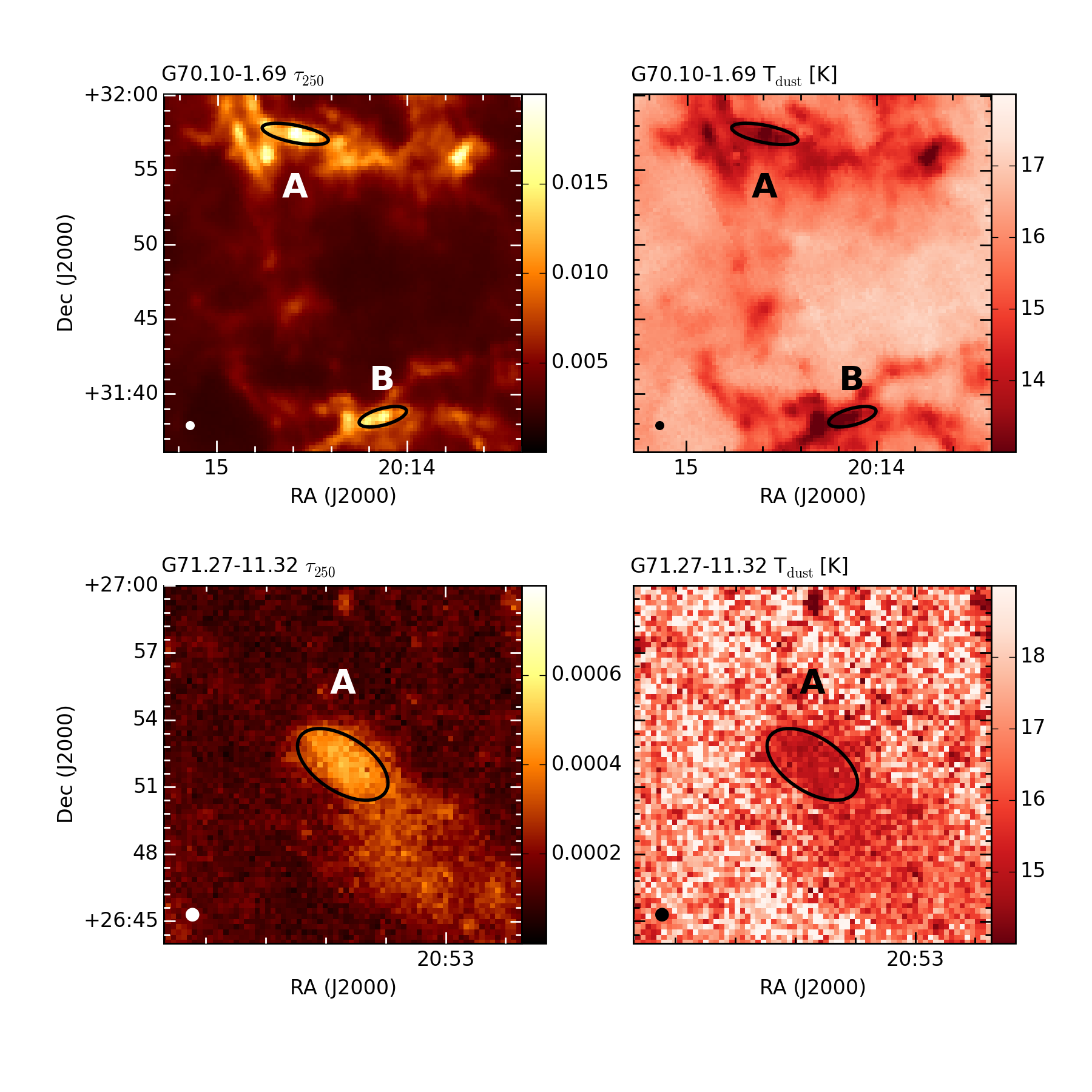 Herschel-based τ250 and Tdust maps of the clumps. Black ellipses mark the 2D Gaussians fitted to the clumps and they are marked with the letter ID of the respective clumps. A white ellipse in the lower left corner shows the beam size of the Herschel map (37″).