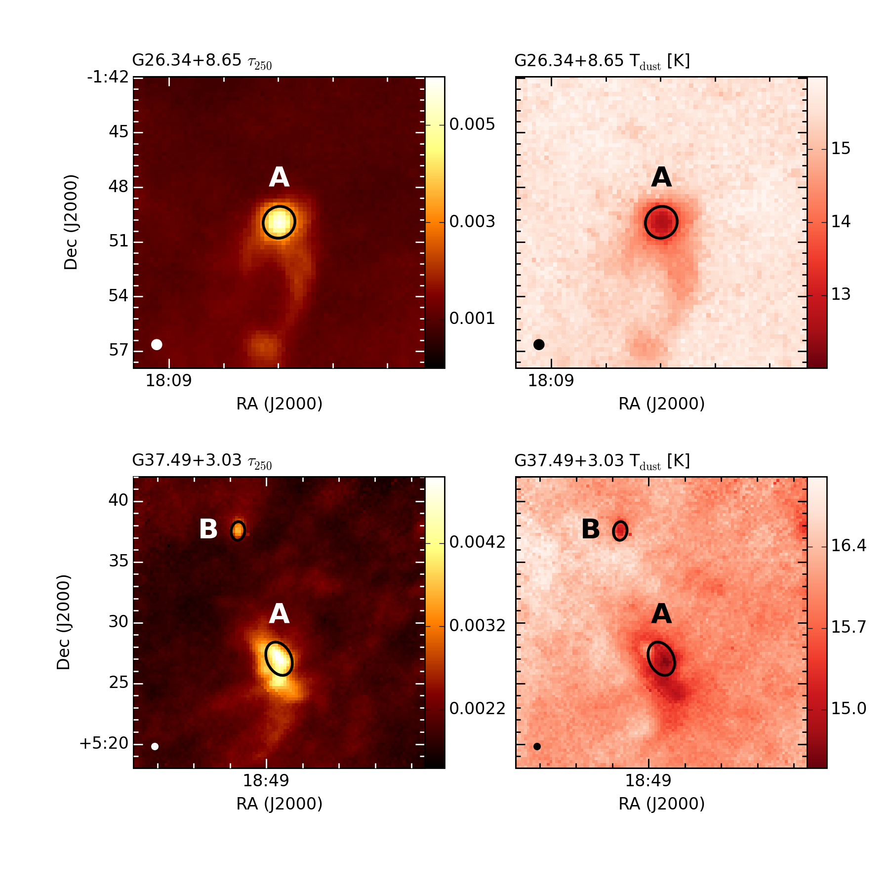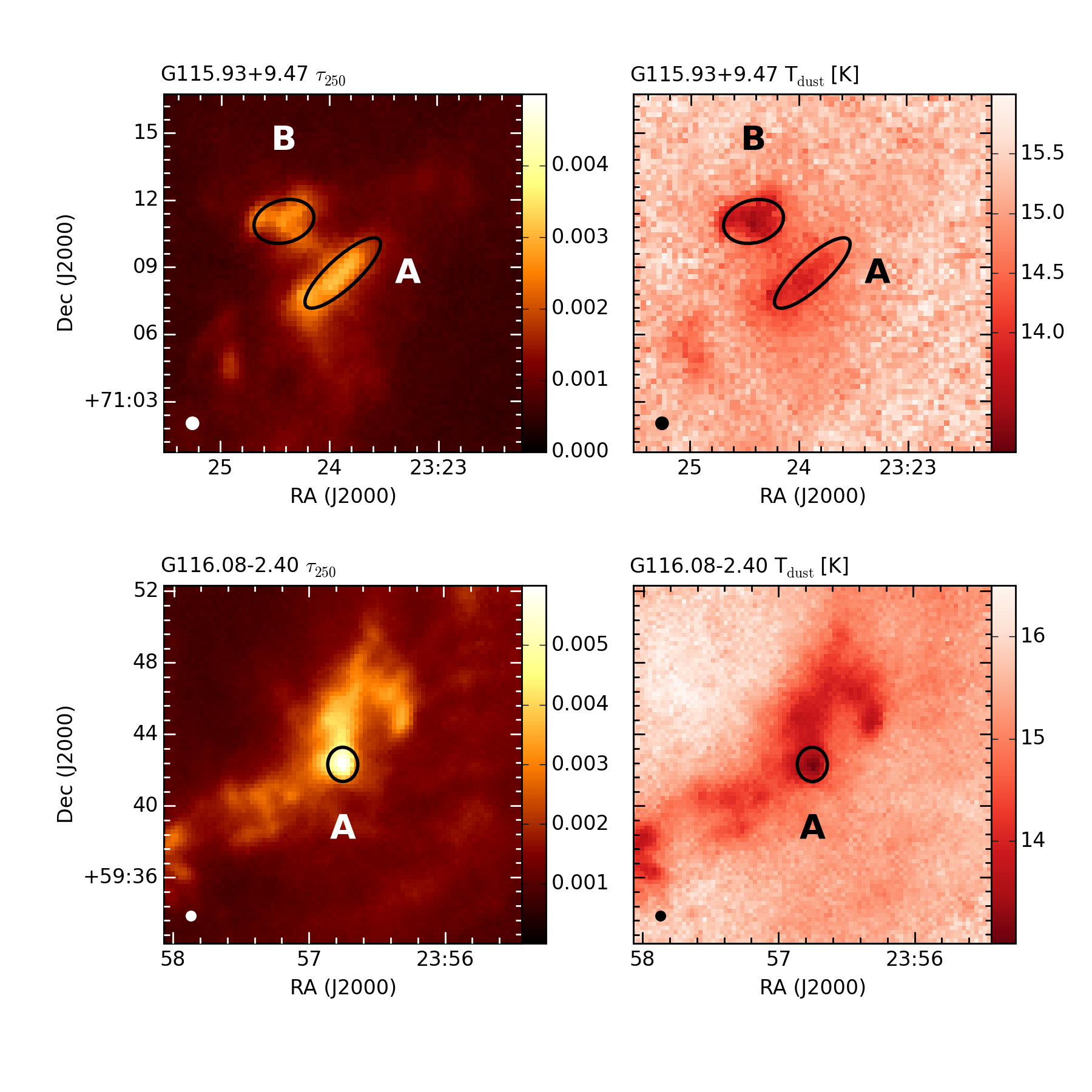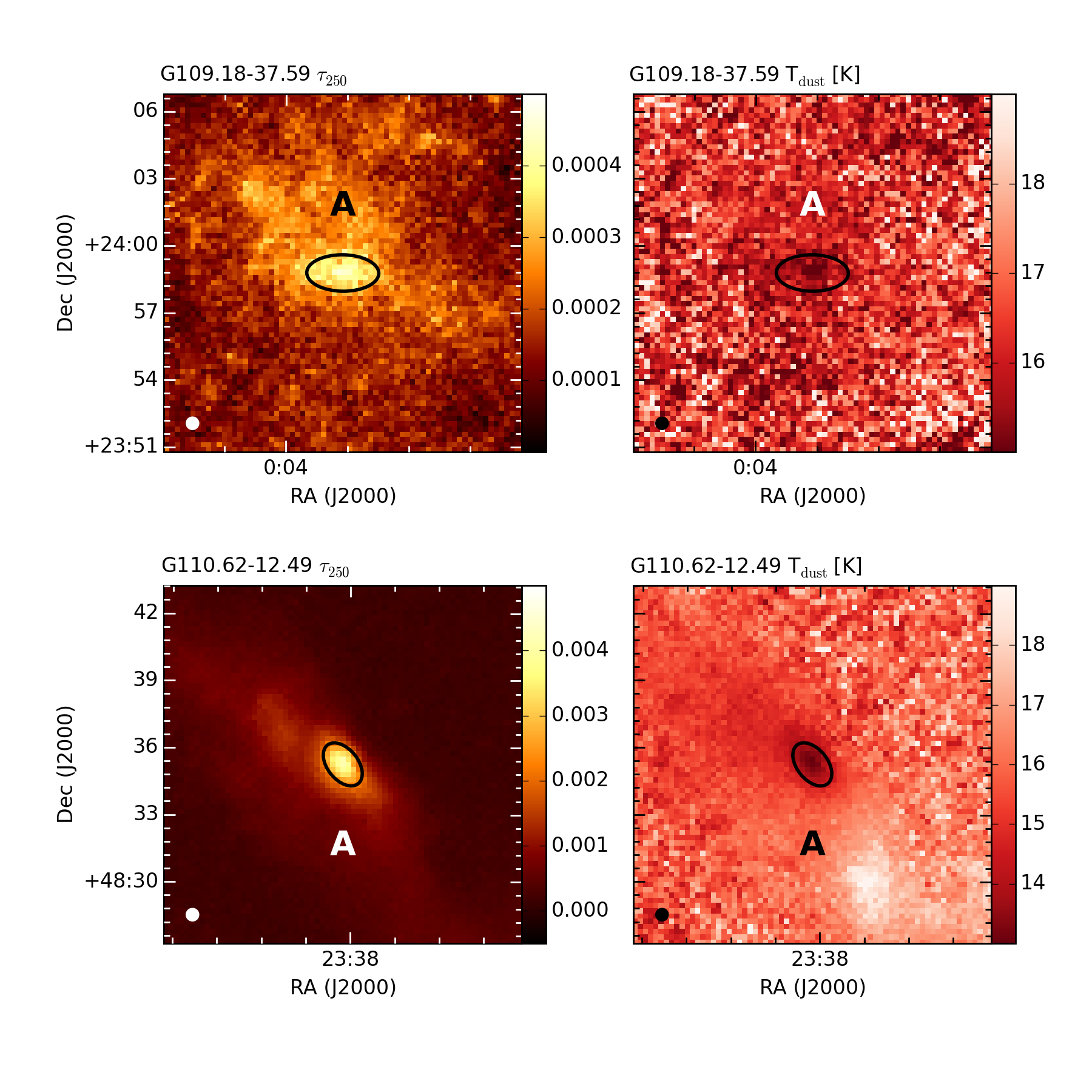 Herschel-based τ250 and Tdust maps of the clumps. Black ellipses mark the 2D Gaussians fitted to the clumps and they are marked with the letter ID of the respective clumps. A white ellipse in the lower left corner shows the beam size of the Herschel map (37″).