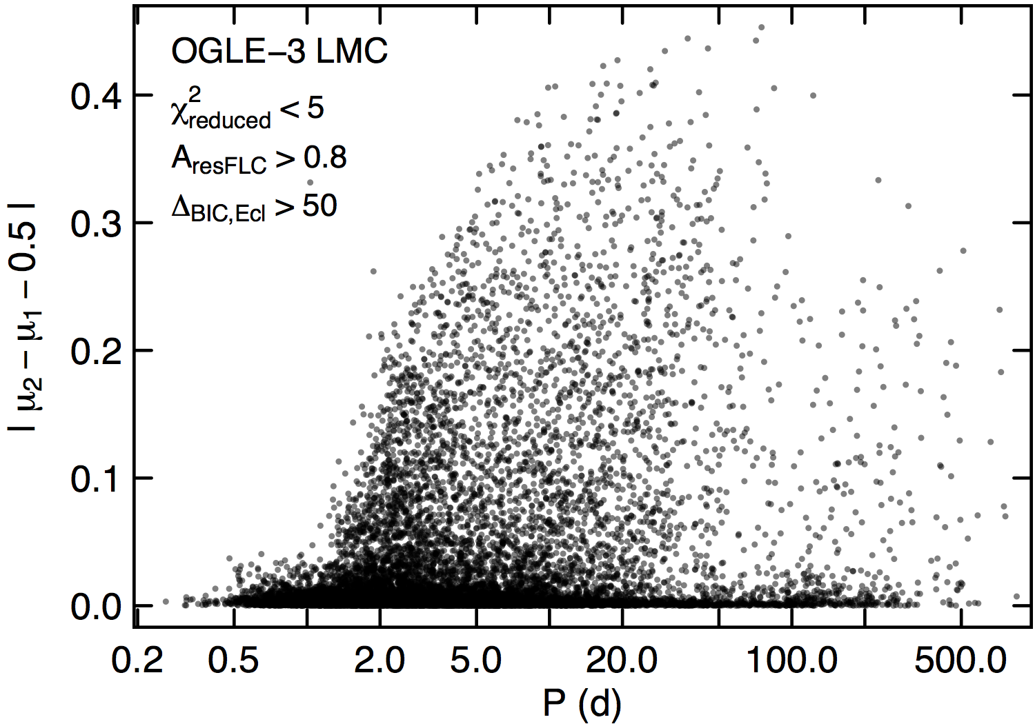 Top panel: projected eccentricity, measured by the deviation | μ2−μ1−0.5 | of the eclipse separation in phase with respect to 0.5, versus orbital period for all sources with
