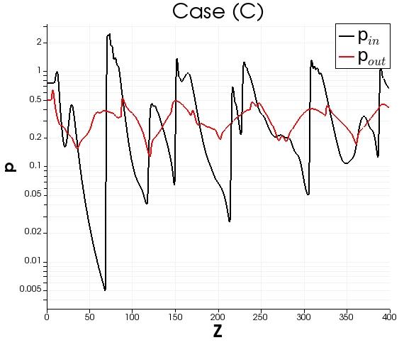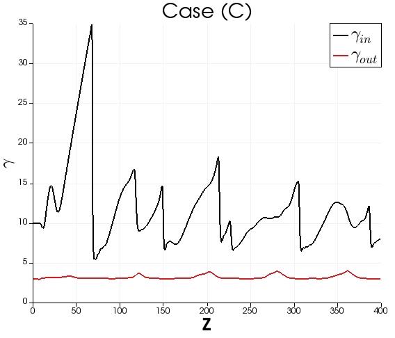 Case (C): variation along line R = 0.01 Rin inside the inner jet (black line) and along the line R = 2 Rin external jet component (red line) of the pressure (left) and the Lorentz factor (right).