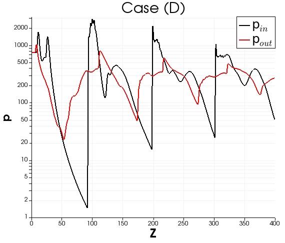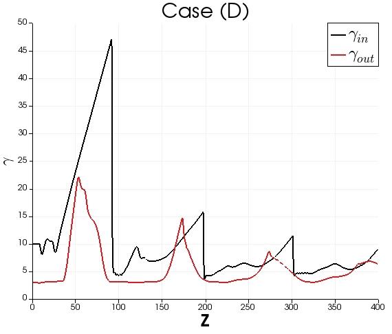 Case (D): variation along line R = 0.01 Rin inside the inner jet (black line) and along the line R = 2 Rin external jet component (red line) of the pressure (left) and the Lorentz factor (right).