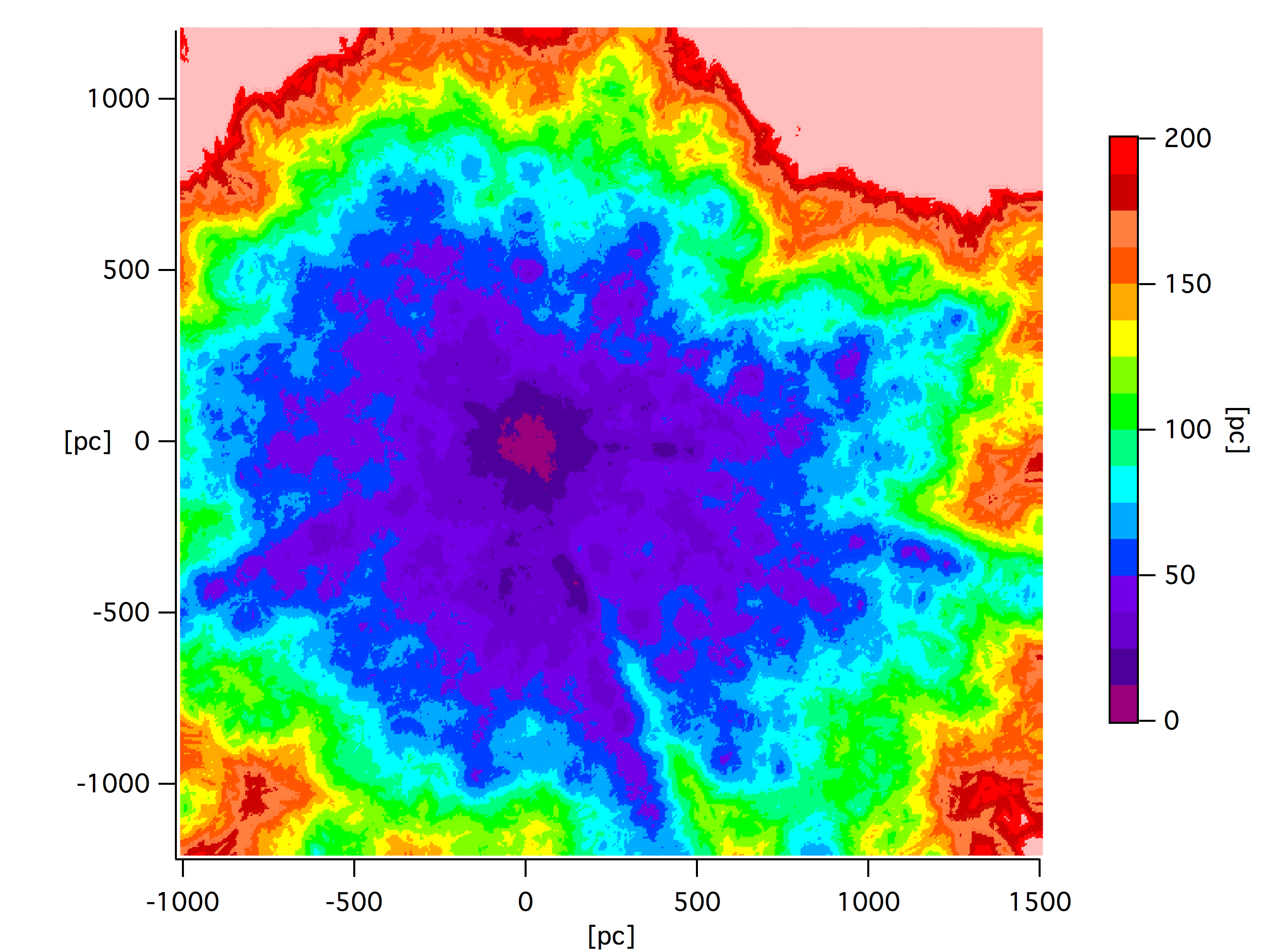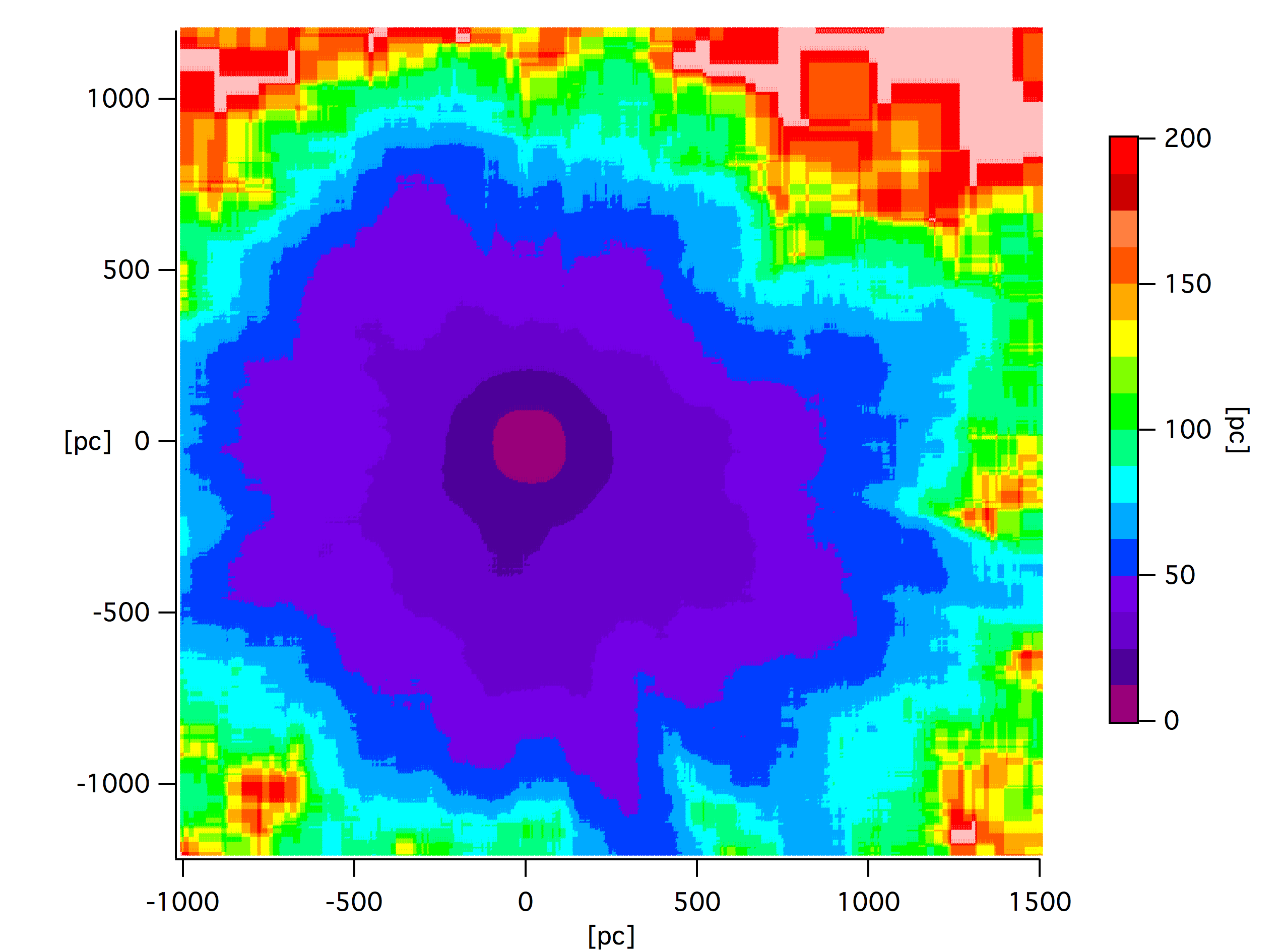 Error in the distance due to the limited target space density, in the Galactic plane, as estimated from the radii of the smallest spheres that contain at least 10 targets (left figure) or from the target density in a cube of side 200 pc (right). The pale pink color corresponds to errors larger than 200 pc.