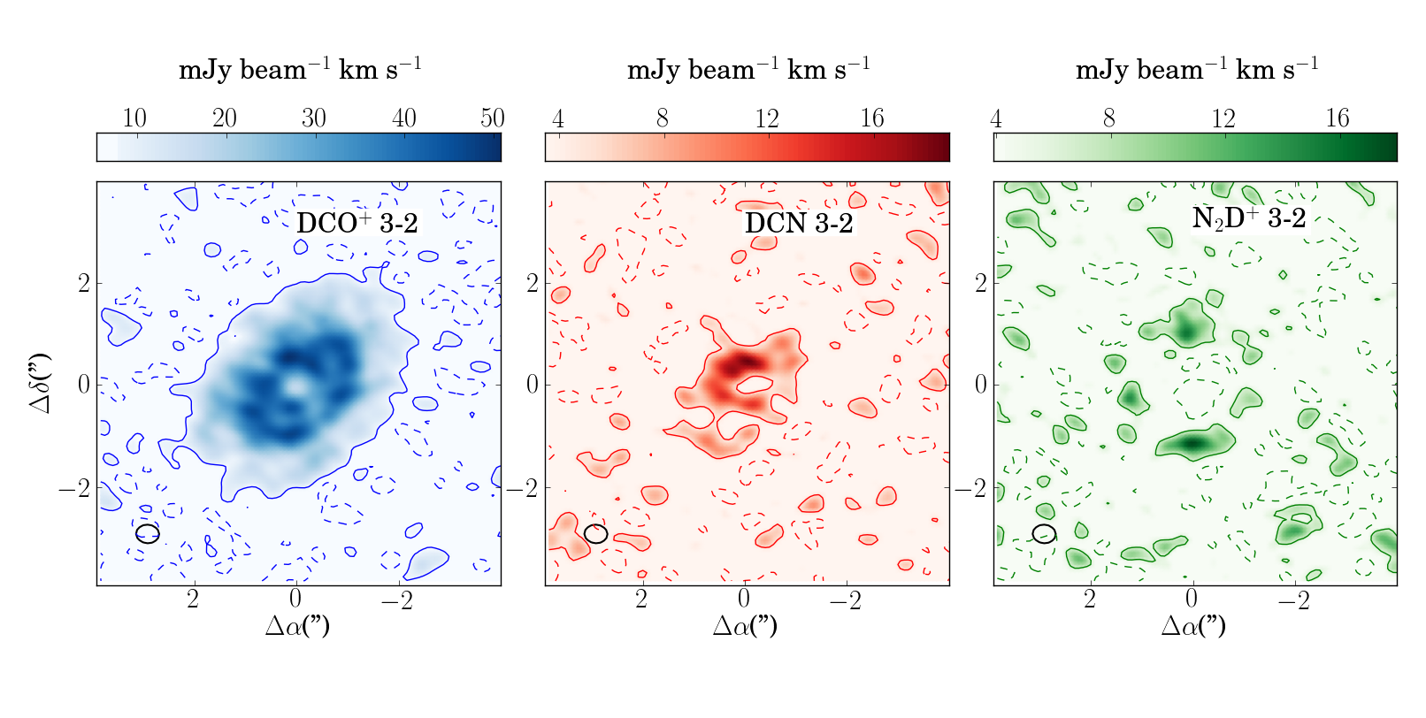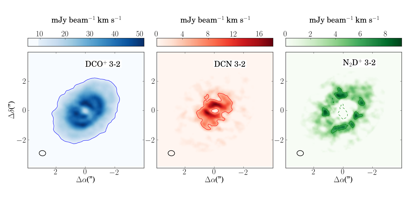Integrated intensity maps of DCO+, N2D+, and DCN with (lower panels) and without (upper panels) a Keplerian mask as explained in Appendix A. The resulting synthesized beams of
