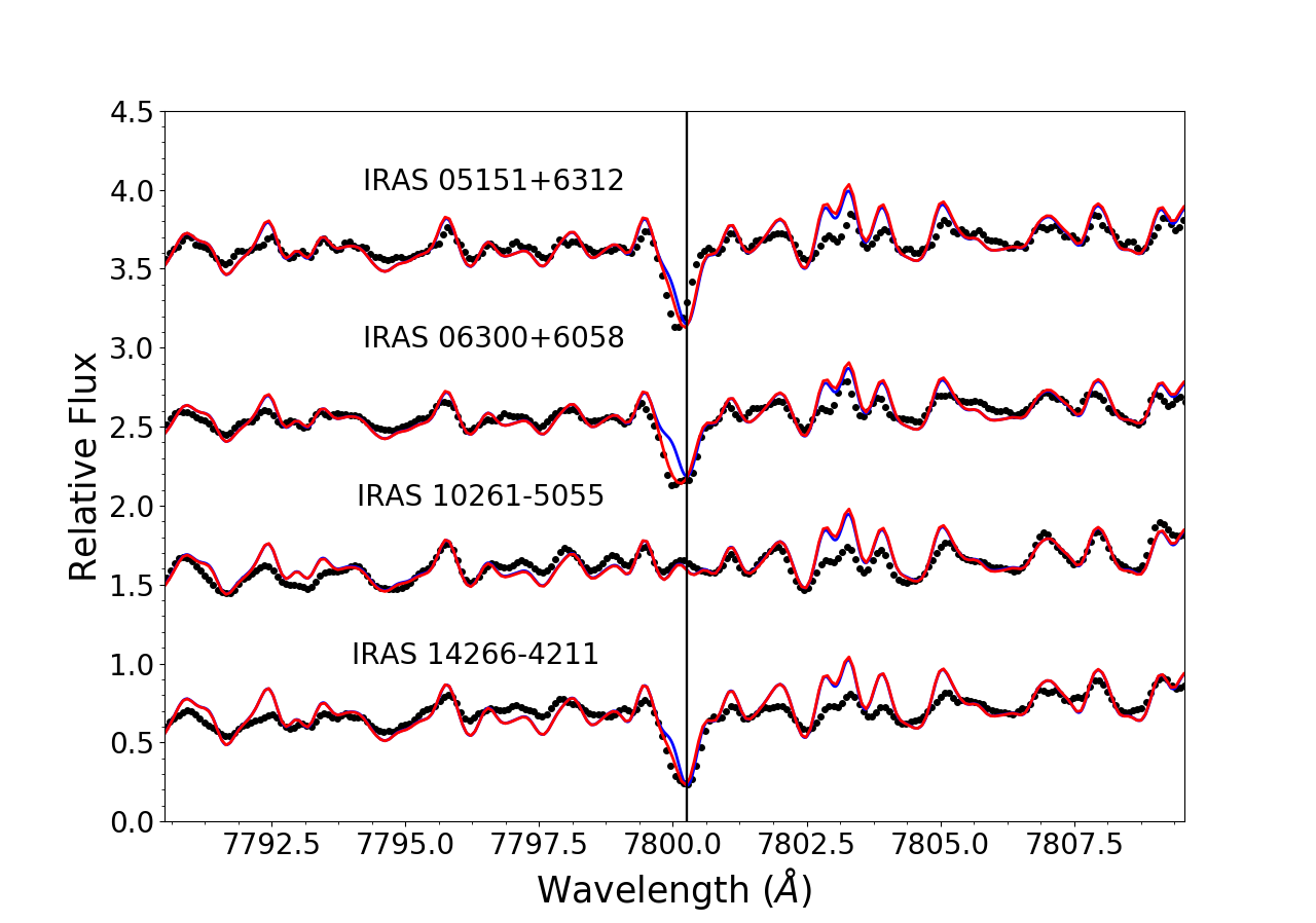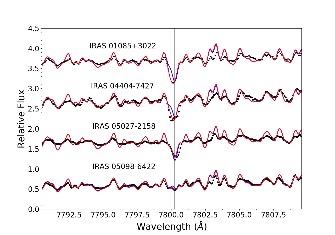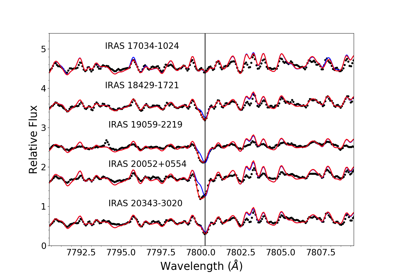 Observed spectra (black dots), best hydrostatic (blue lines) and pseudo-dynamical (red lines) fits of our sample of AGB stars in the regions of 7800 Å Rb I line (left panels) and 6474 Å ZrO bandhead (right panels). The parameters of the best fit model atmospheres are indicated in Table 3. The plots are displayed in increasing R.A. order.