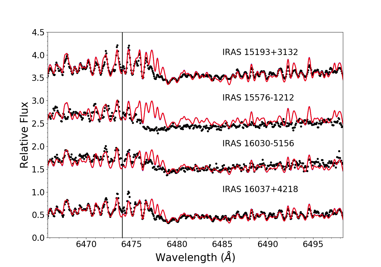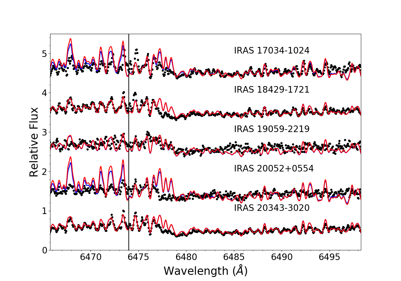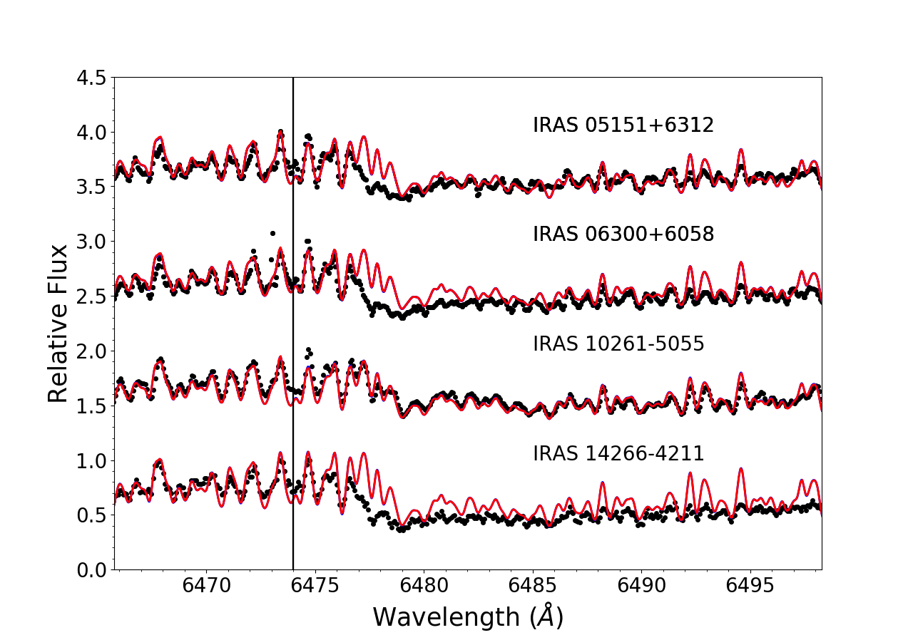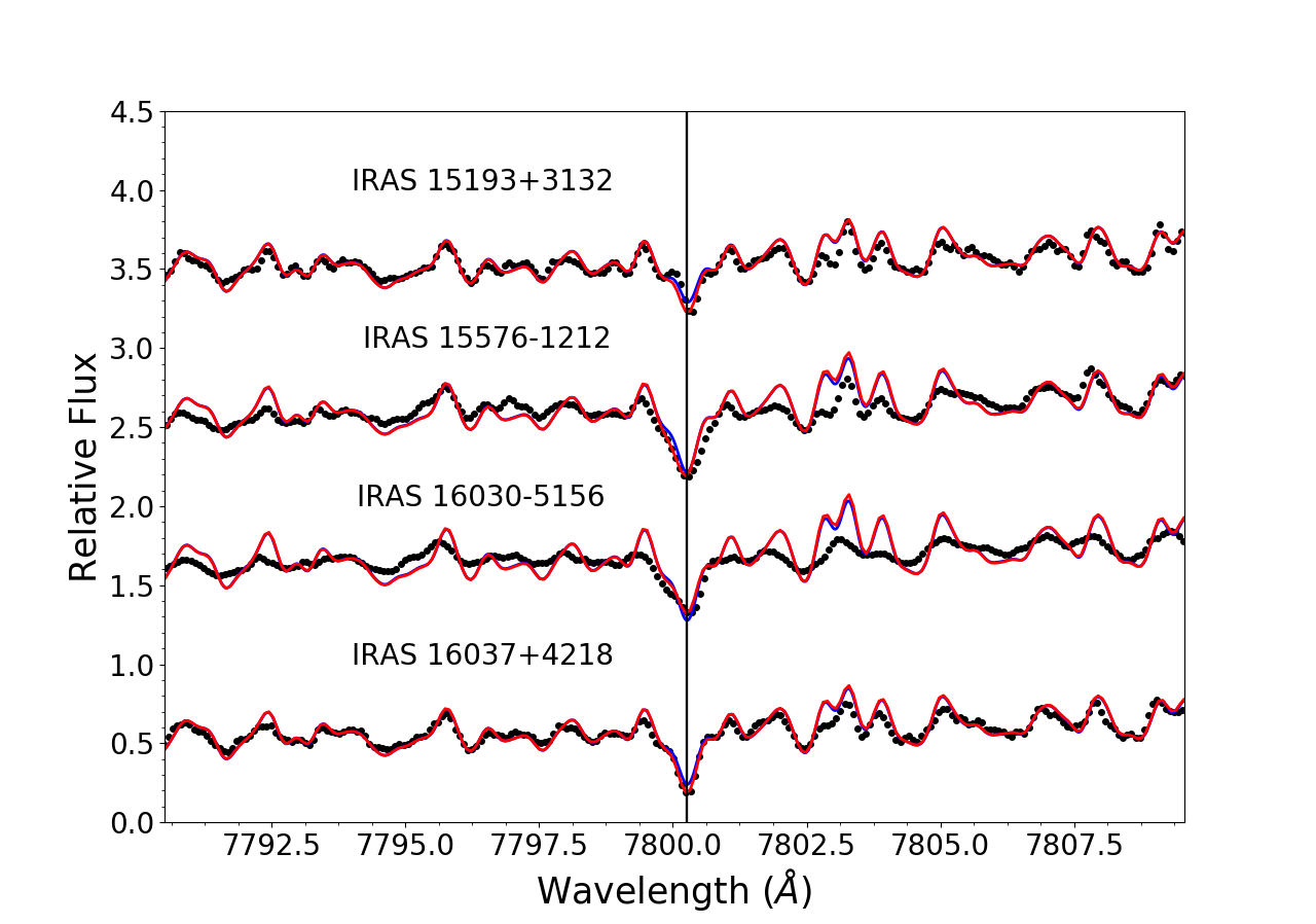 Observed spectra (black dots), best hydrostatic (blue lines) and pseudo-dynamical (red lines) fits of our sample of AGB stars in the regions of 7800 Å Rb I line (left panels) and 6474 Å ZrO bandhead (right panels). The parameters of the best fit model atmospheres are indicated in Table 3. The plots are displayed in increasing R.A. order.