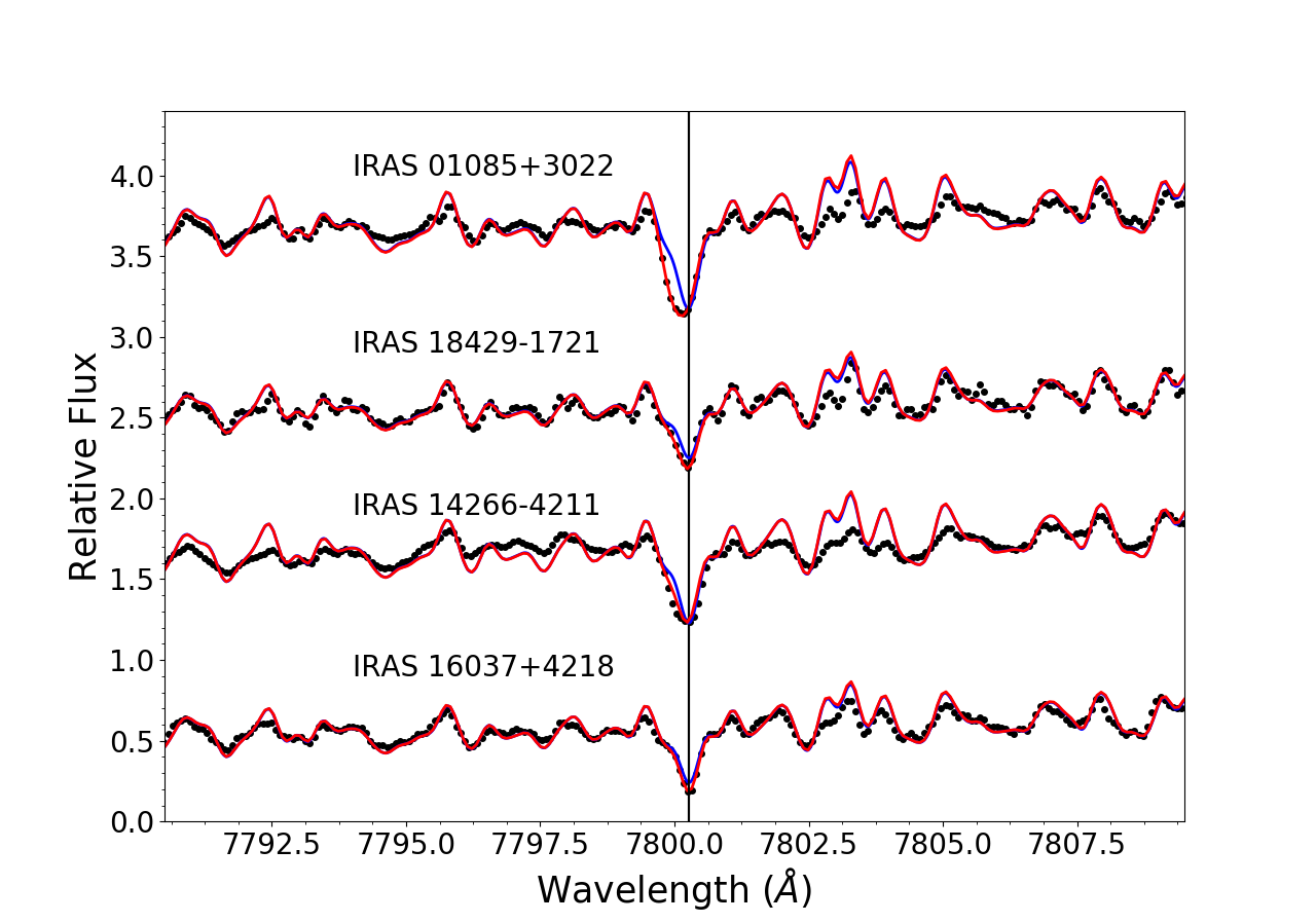 Rb I 7800 Å (left panel) and ZrO 6474 Å (right panel) spectral regions in massive Galactic AGB stars. The pseudo-dynamical models (red lines) that best fit the observations (black dots) are shown in four sample stars. For comparison, the hydrostatic models are also displayed (blue lines). The location of the Rb I line and the ZrO bandhead are indicated by black vertical lines.