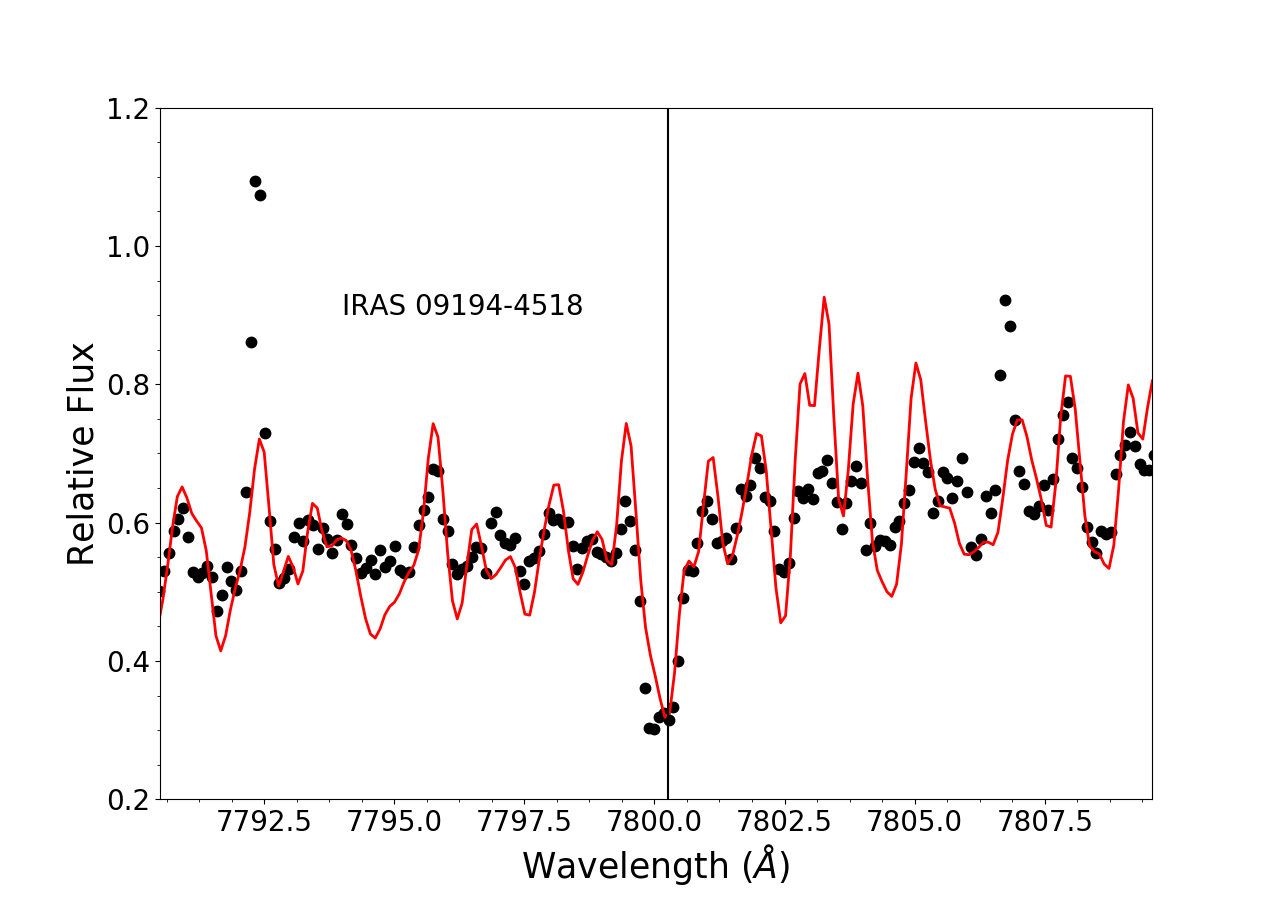 IRAS 07222−2005 (left panel) and IRAS 09194−4518 (right panel) display two components (circumstellar and photospheric) in the 7800 Å Rb I line (black line) and cannot be reproduced by our present version of the spectral synthesis code. The red line shows the pseudo-dynamical synthetic spectrum that gives a good fit to the photospheric component only.