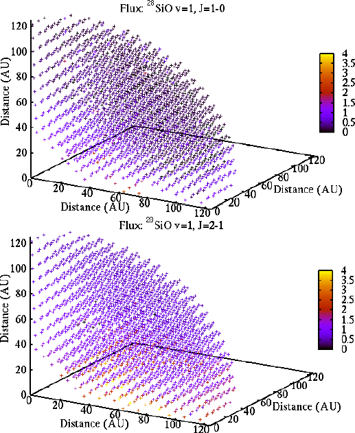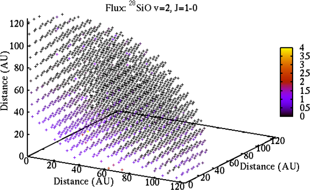 Intensity distribution of simulated SiO maser clumps as a function of distance from the central binary: (top) 28SiO v = 2, J = 1−0 maser clumps; (center) 28SiO v = 1, J = 1−0 maser clumps; (bottom) 28SiO v = 1, J = 2−1 maser clumps.